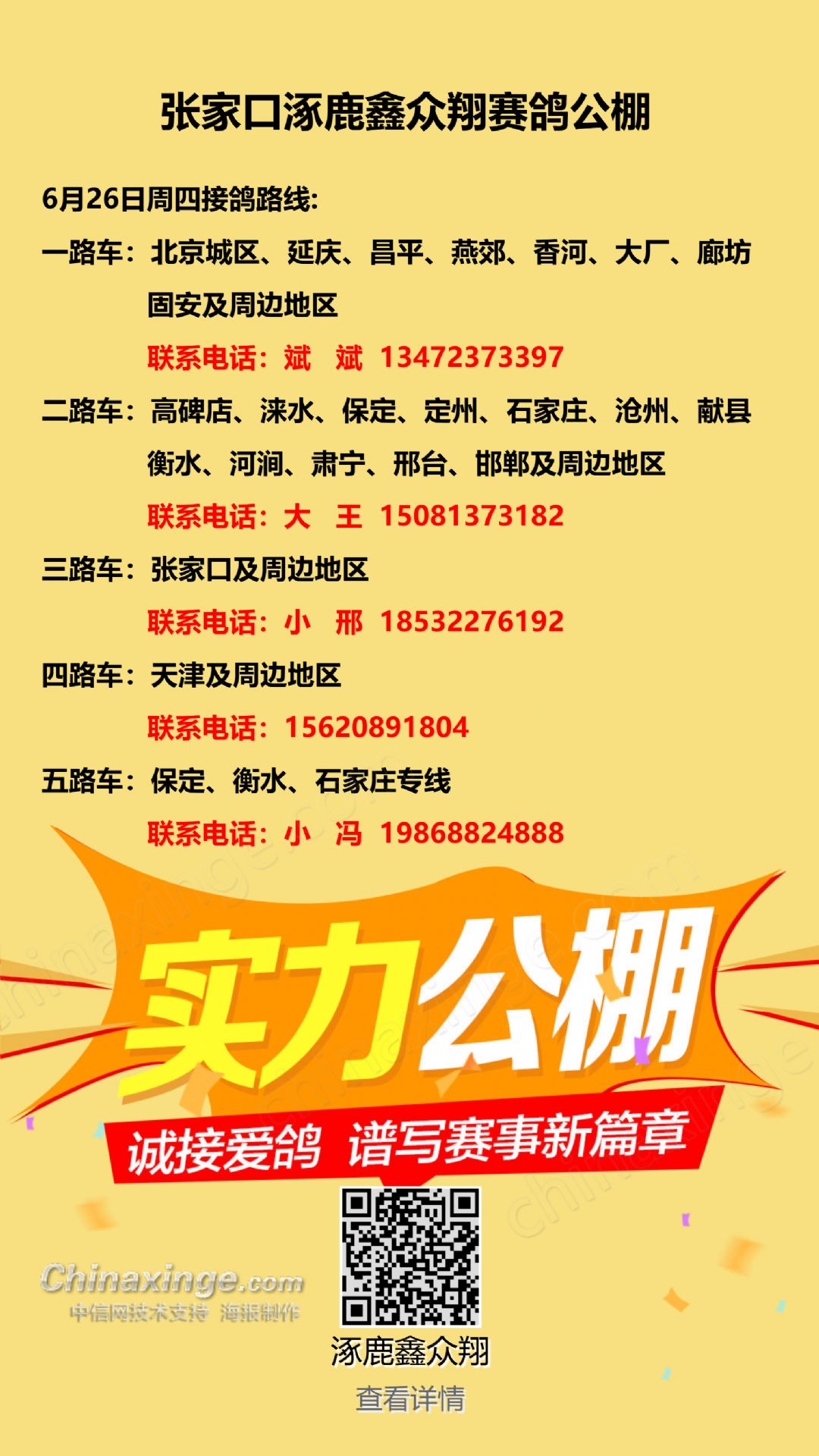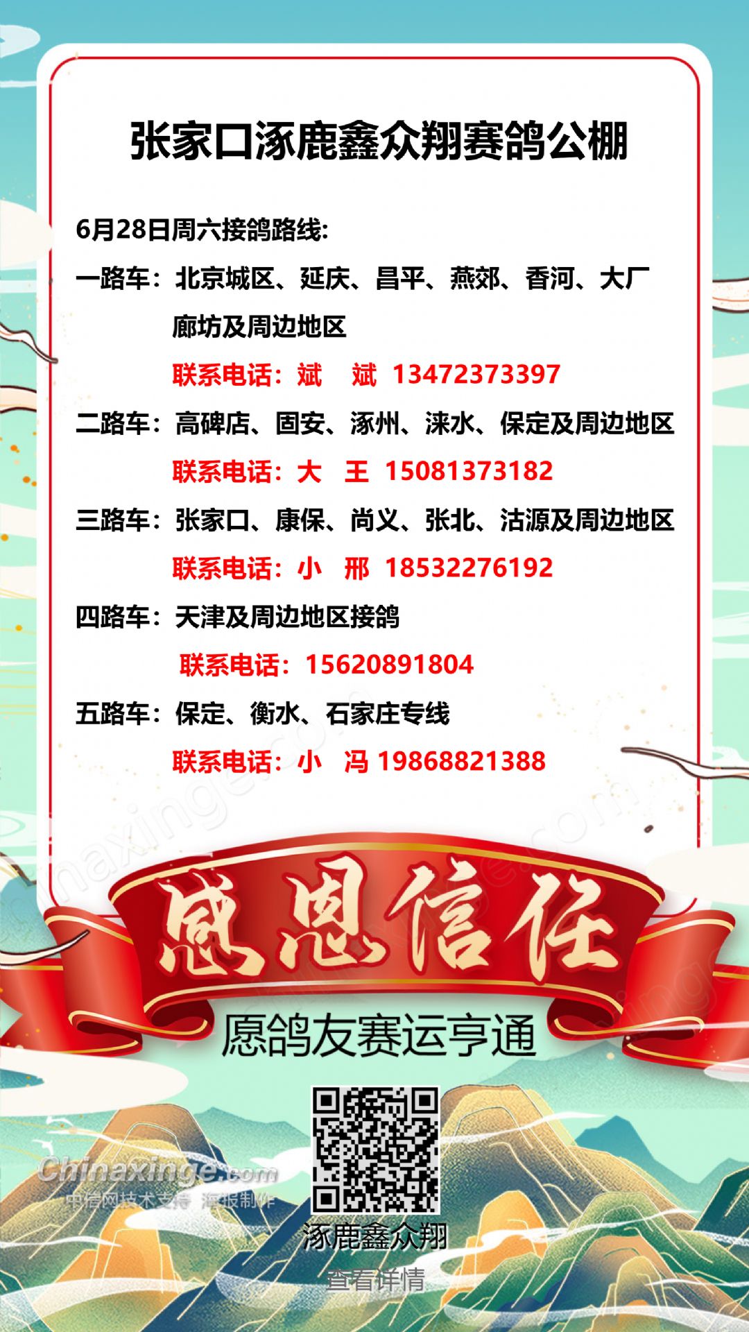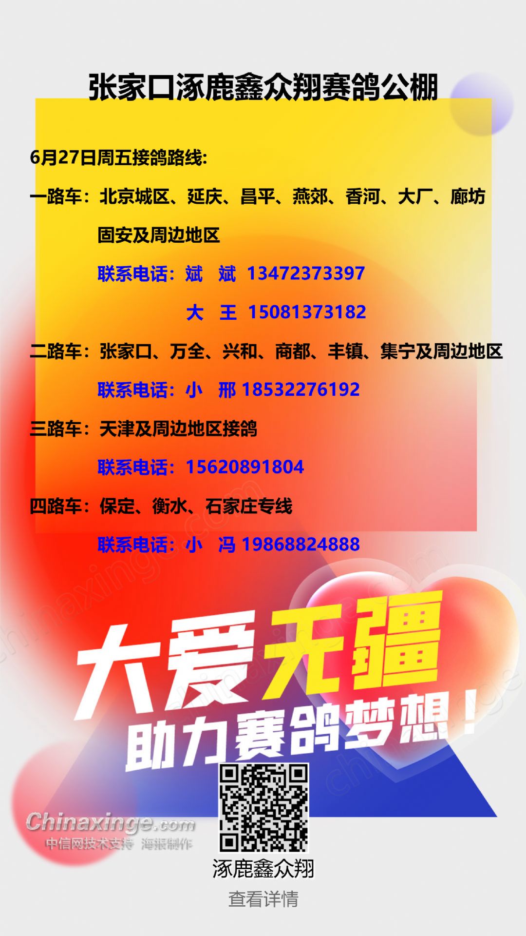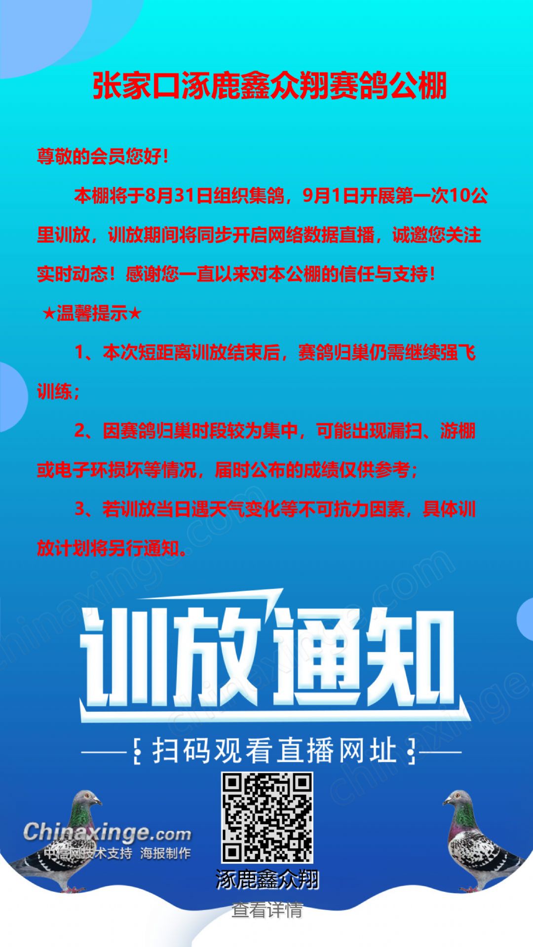 张家口涿鹿鑫众翔赛鸽公棚正式封棚公告