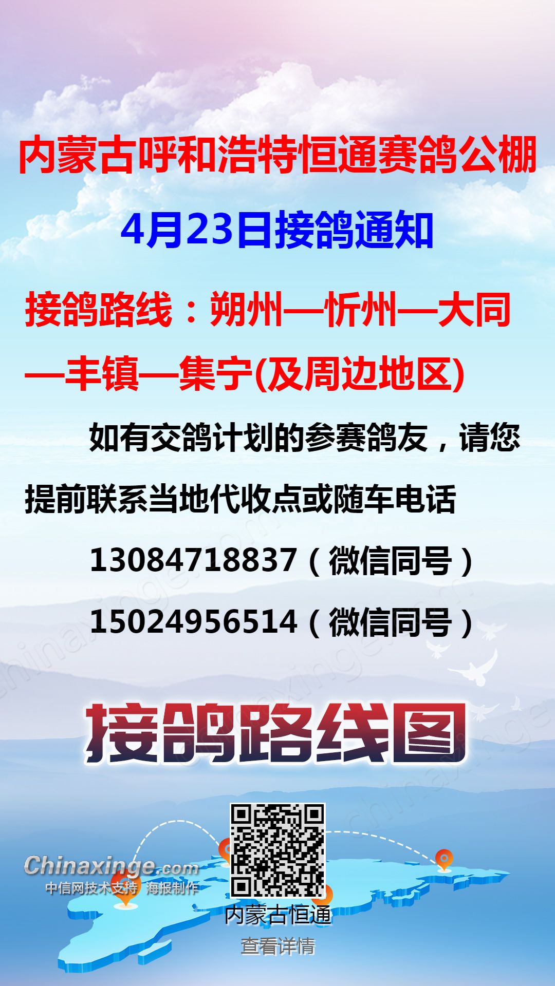 恒通赛鸽公棚4月23日大同、集宁方向接鸽通知