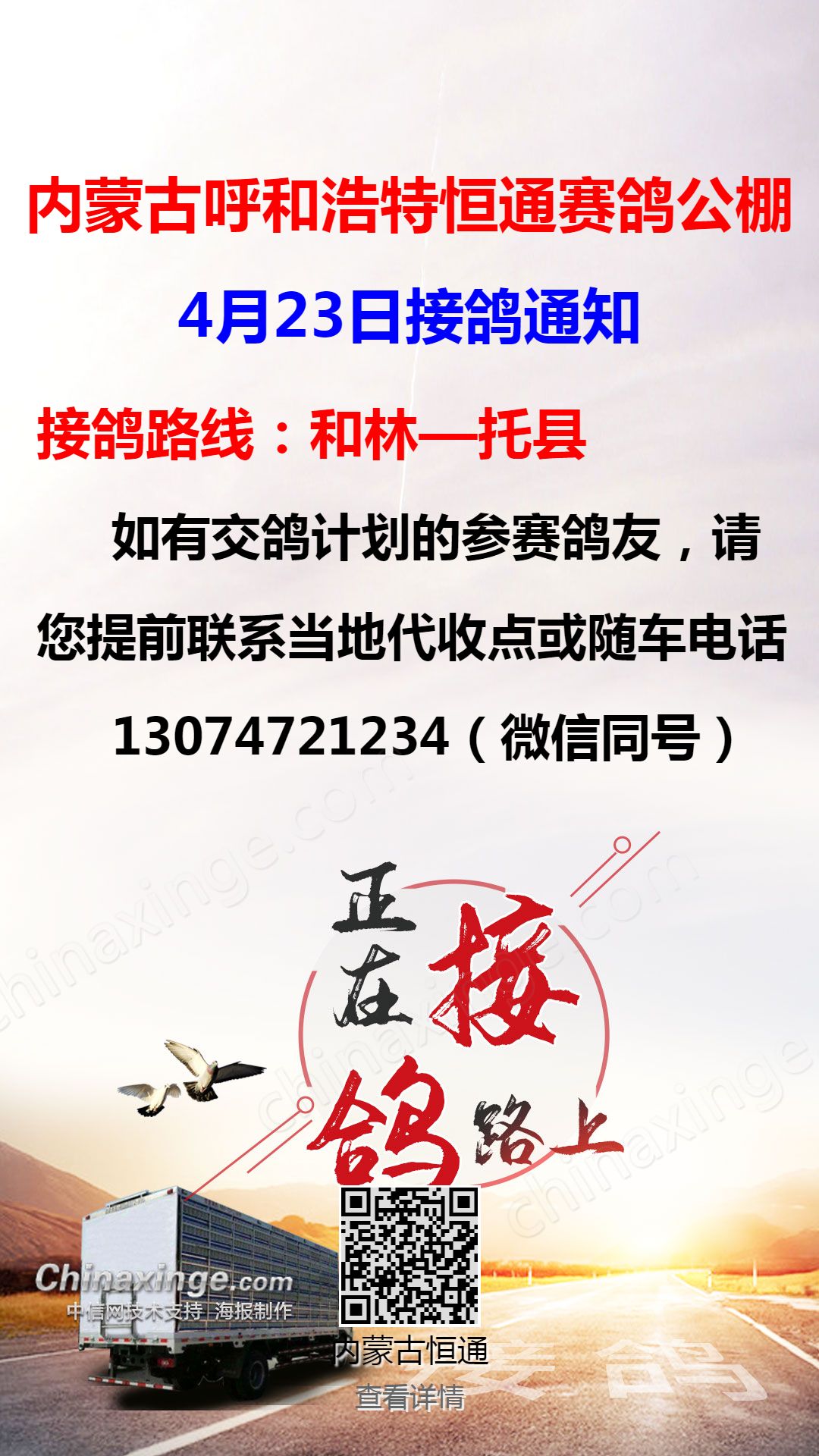 恒通赛鸽公棚4月23日和林、托县方向接鸽通知