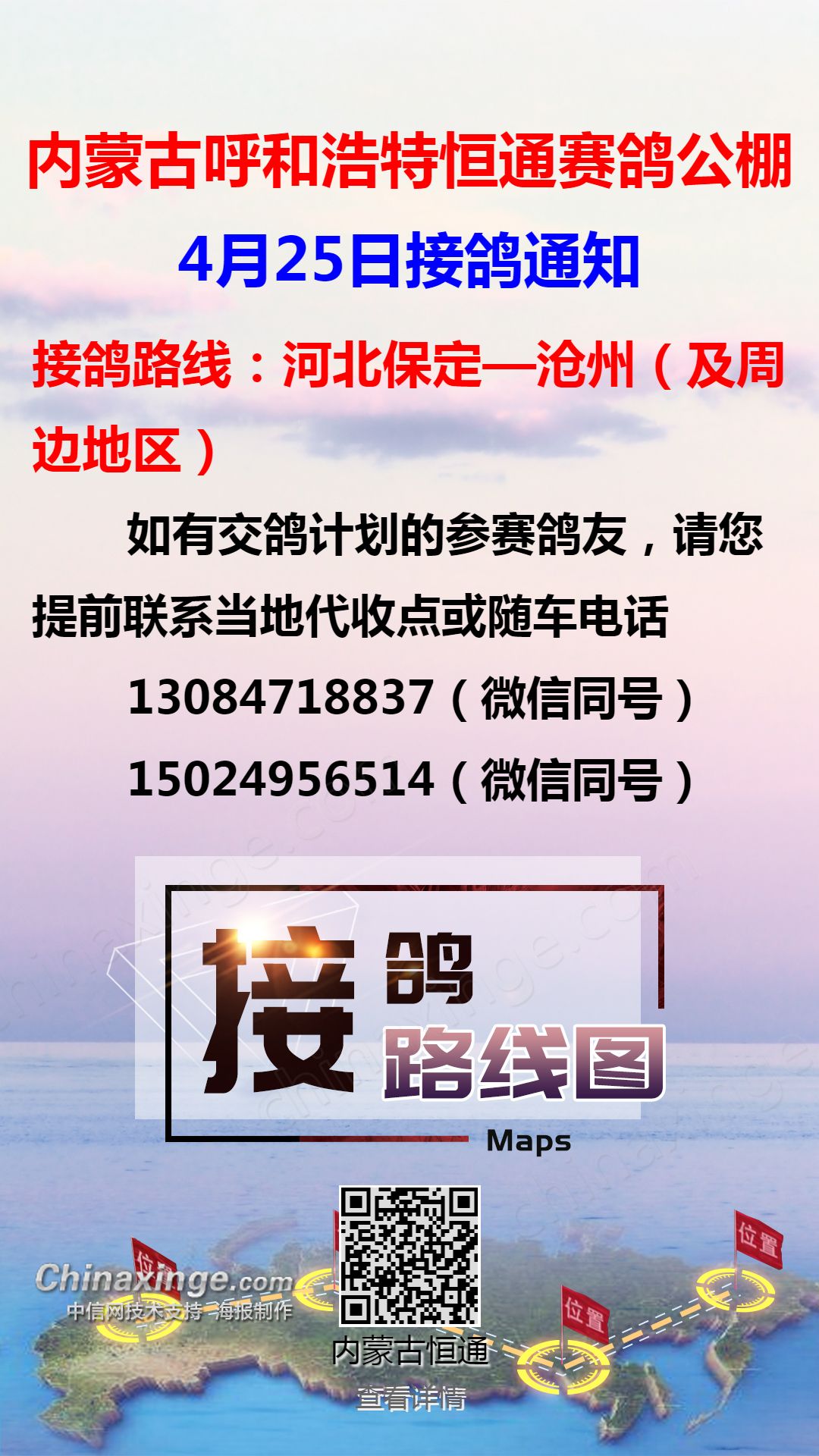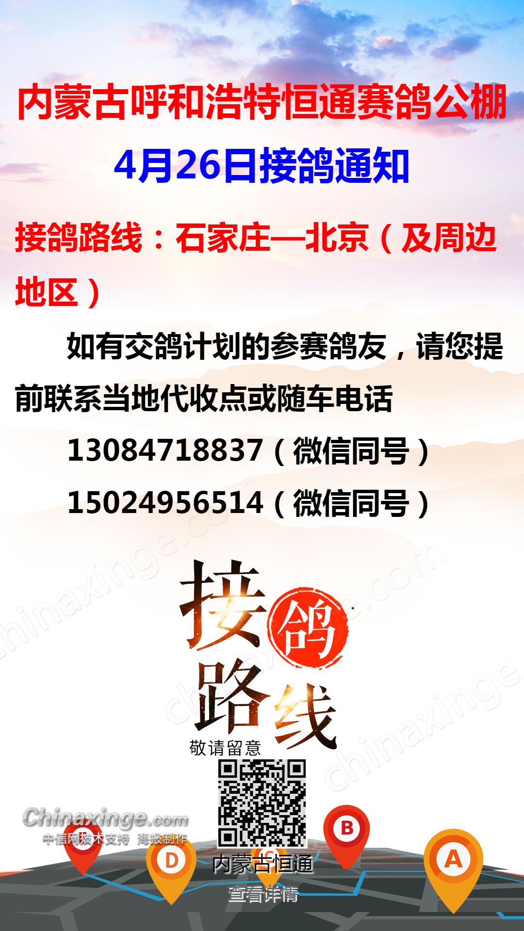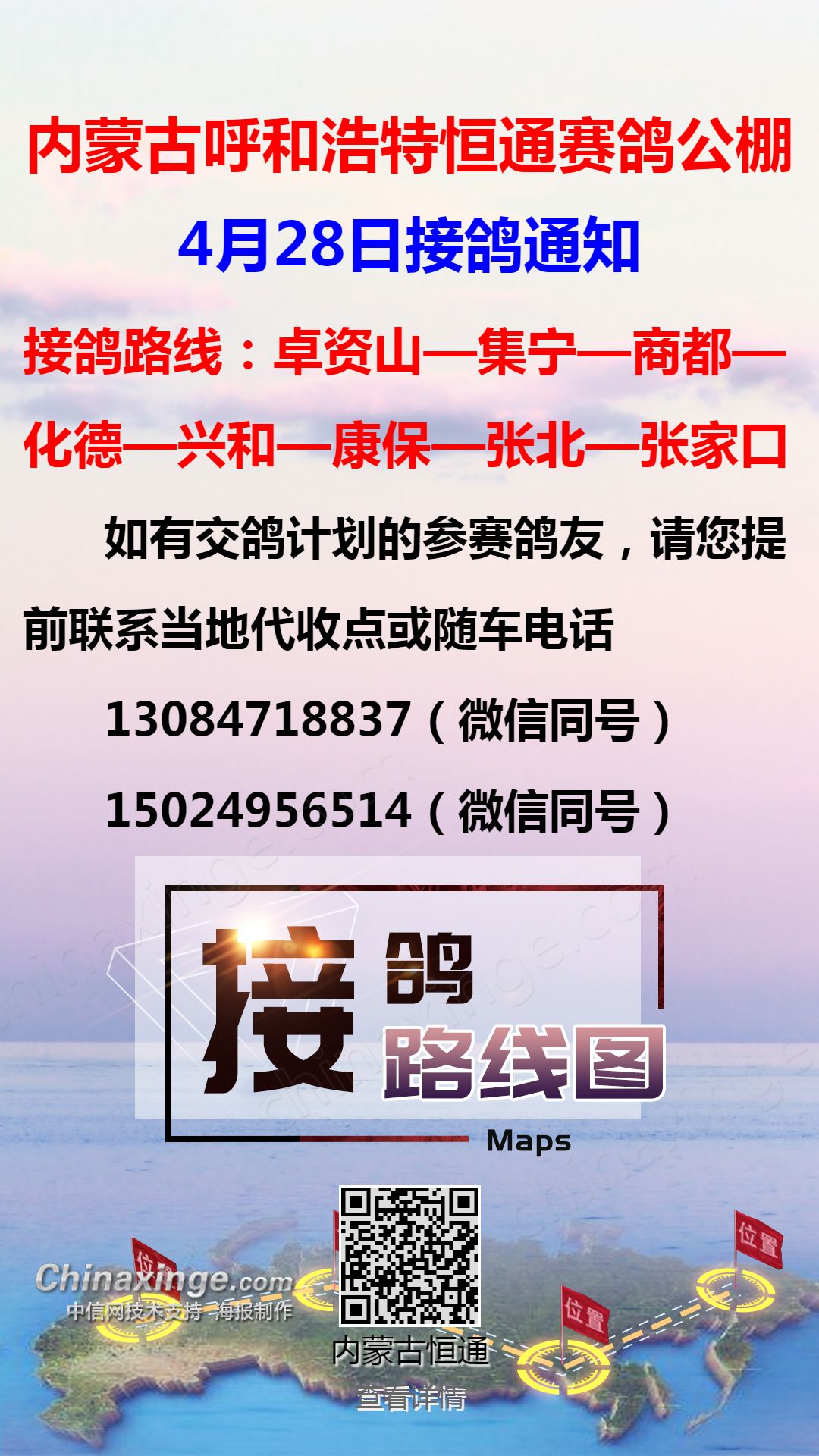 恒通赛鸽公棚4月28日集宁、化德、张北方向接鸽通知