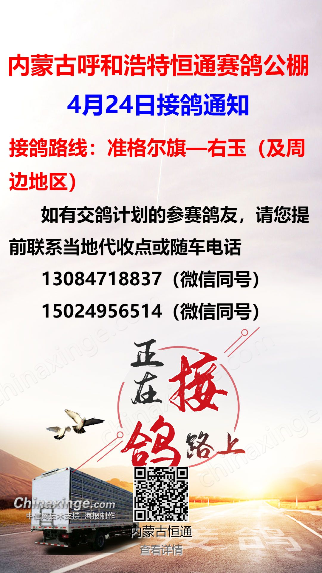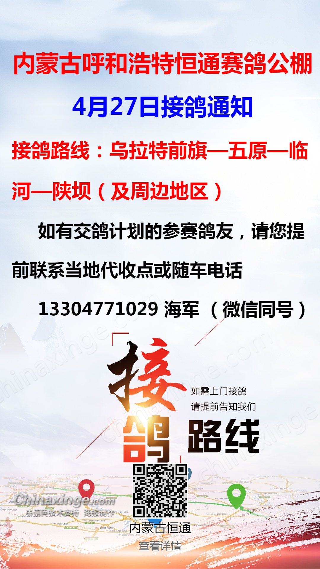 恒通赛鸽公棚4月27日五原、临河方向接鸽通知