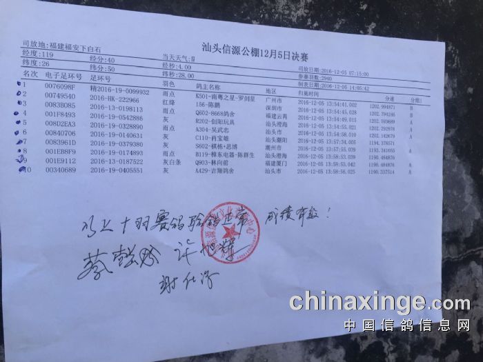 汕头信源公棚12月5日决赛前十名验鸽照片