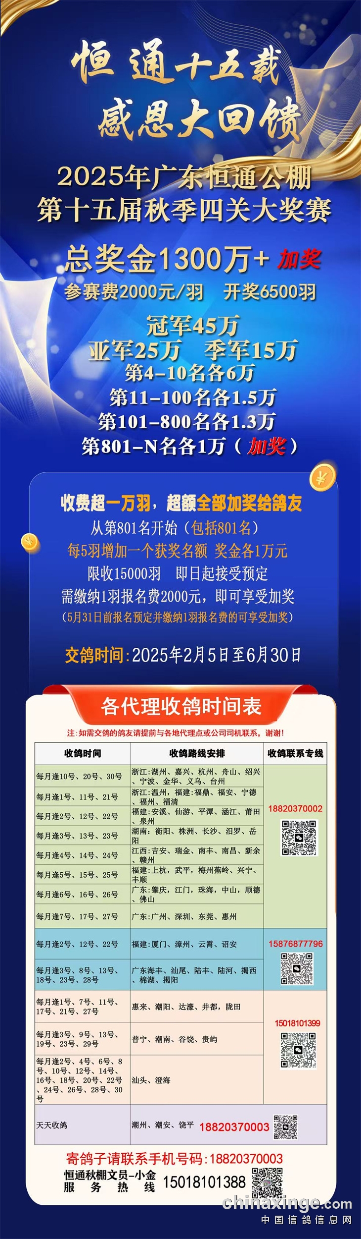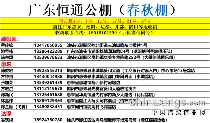| 尊敬的鸽友,大家好!广东恒通(春、秋)棚定于4月26号前往
