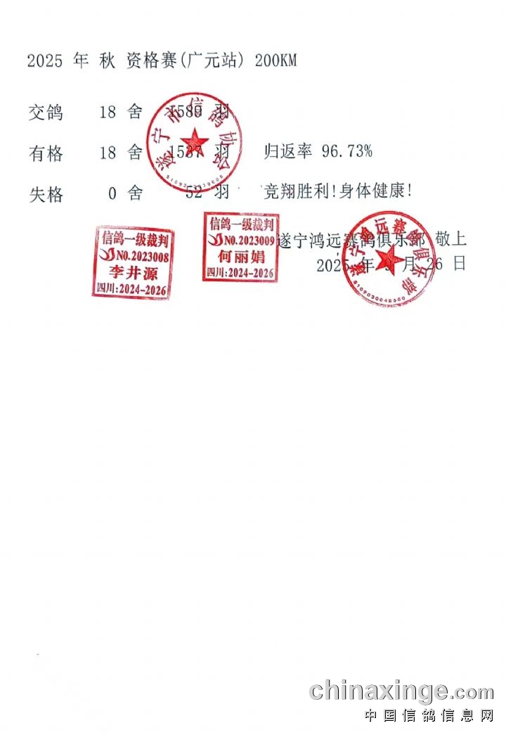 遂宁鸿远赛鸽俱乐部2025秋资格赛监放单及执裁报告
