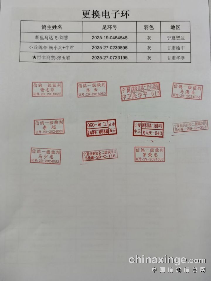 宁夏中卫赛鸽公棚100公里清棚站更换电子环名单