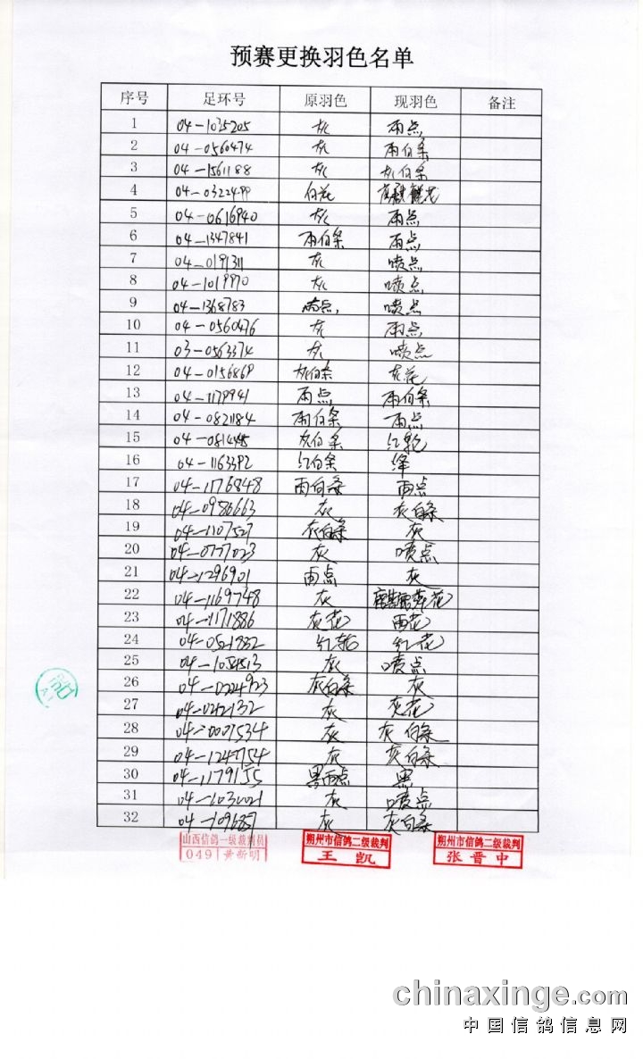 预赛更改羽色、电子环及集鸽名单执行裁判签字确认