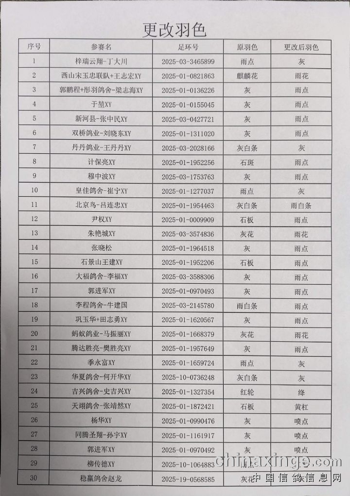 涿州翔友国际赛鸽公棚100公里收费站羽色更改