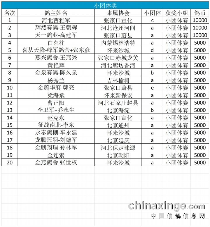 河北宏建赛鸽公棚300公里预赛小团体取奖名单