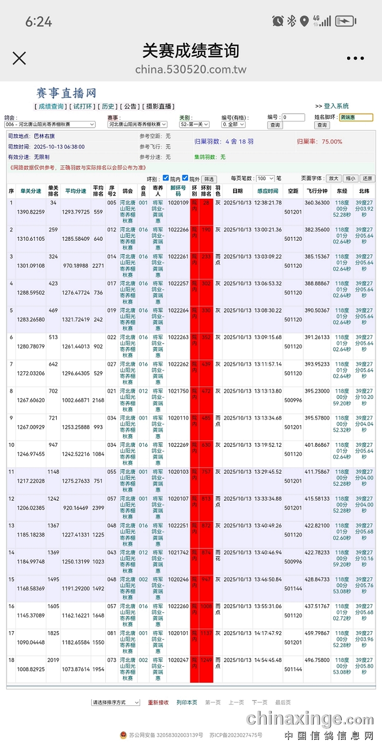 在一周前的唐山阳光寄养棚首关比赛中,姜军先生的赛鸽就已显露出强劲的竞技状态,收获了单关34名、259名、324名、423名、469名等成绩。