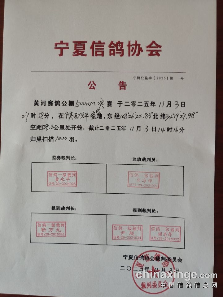 宁夏黄河赛鸽公棚第三关500公里决赛“运动宁夏”黄河杯竞技赛成绩