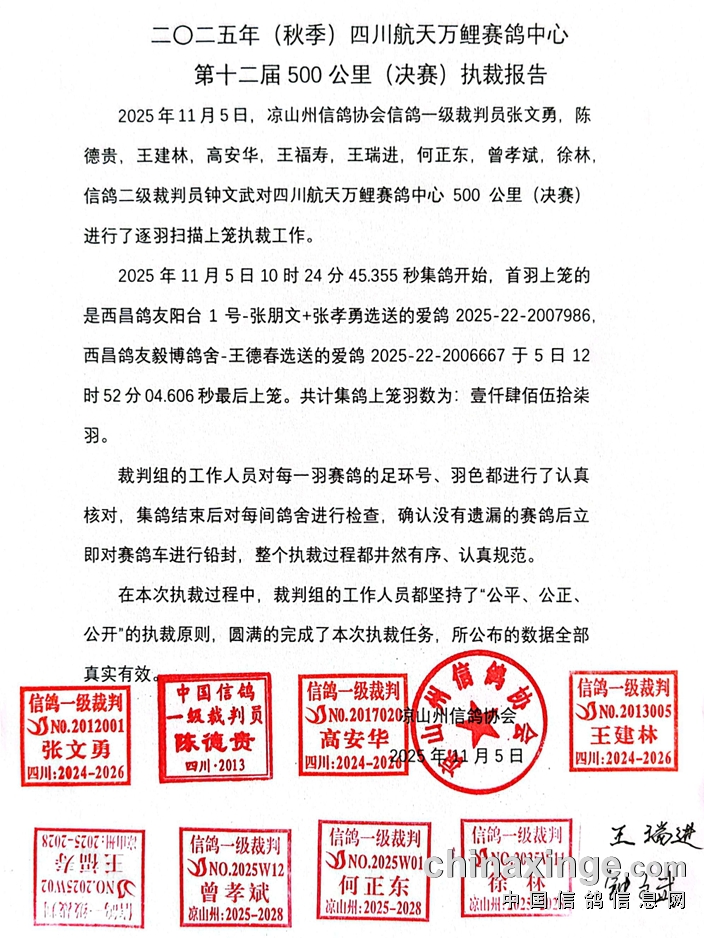 四川航天城万鲤赛鸽中心500KM娱乐赛核对公告