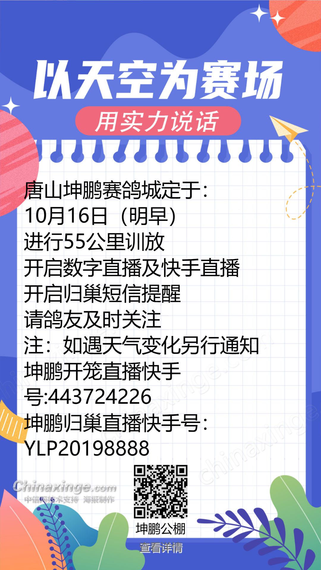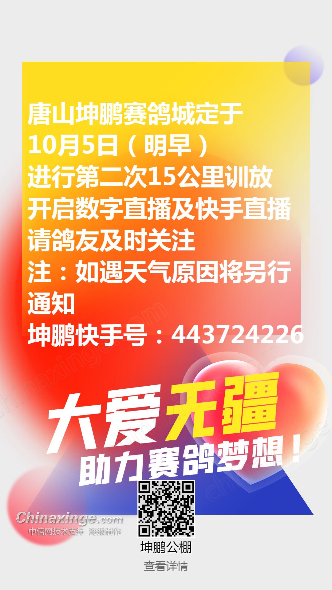 唐山坤鹏赛鸽城第二次15公里训放通知