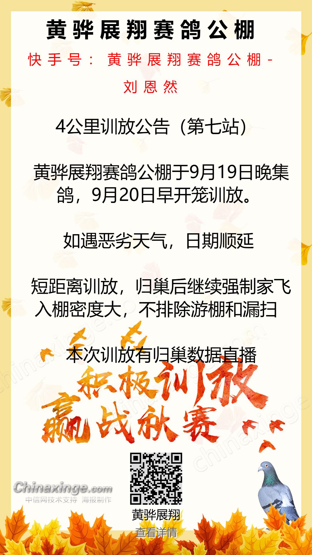 黄骅展翔赛鸽公棚16公里训放公告(第十一站)