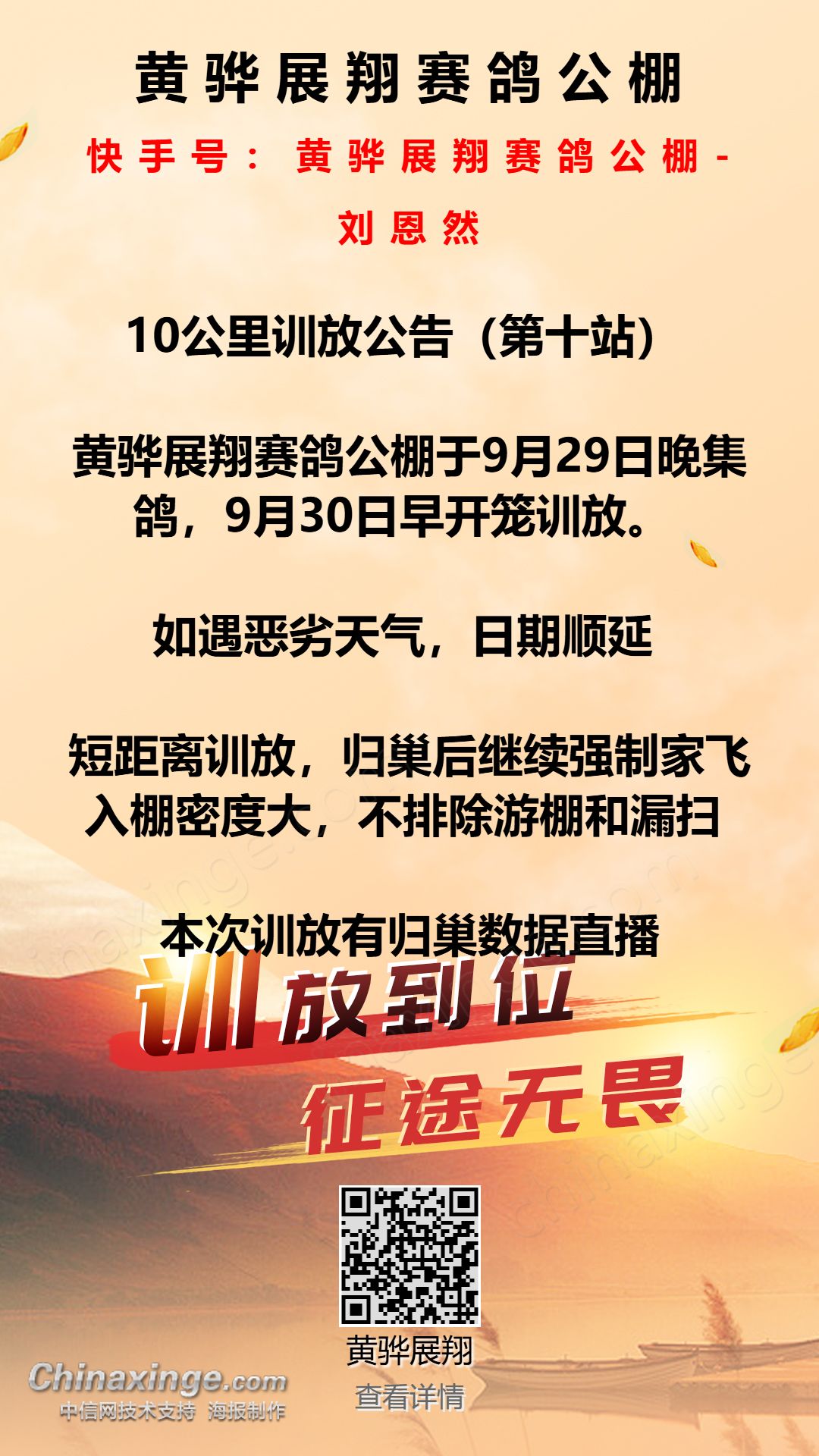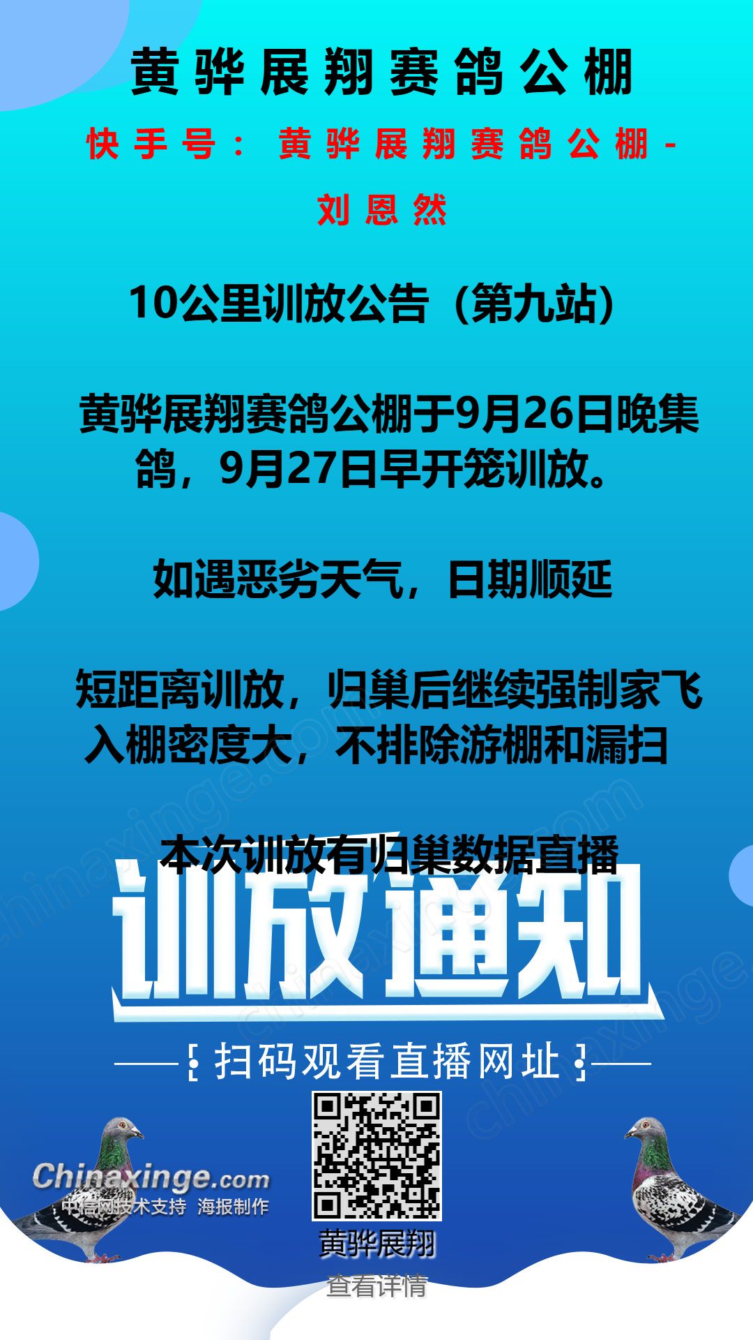 黄骅展翔赛鸽公棚10公里训放公告(第九站)
