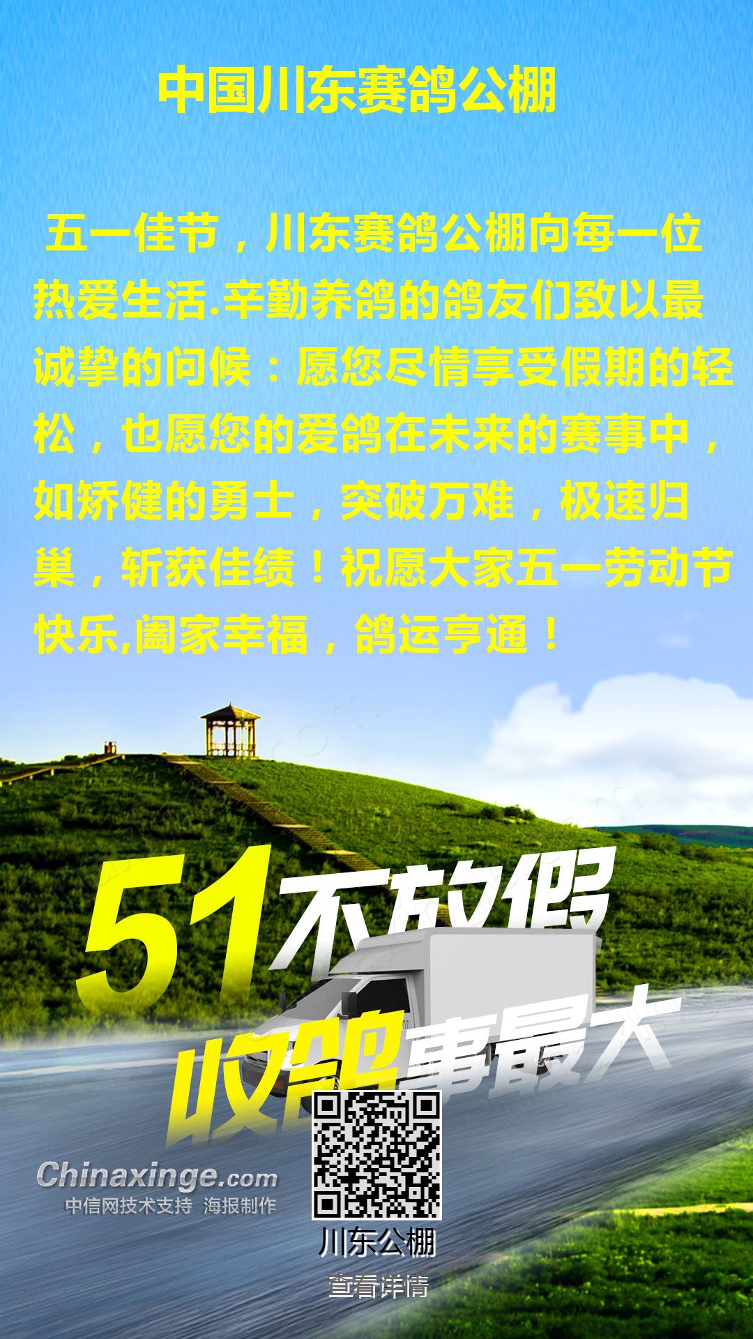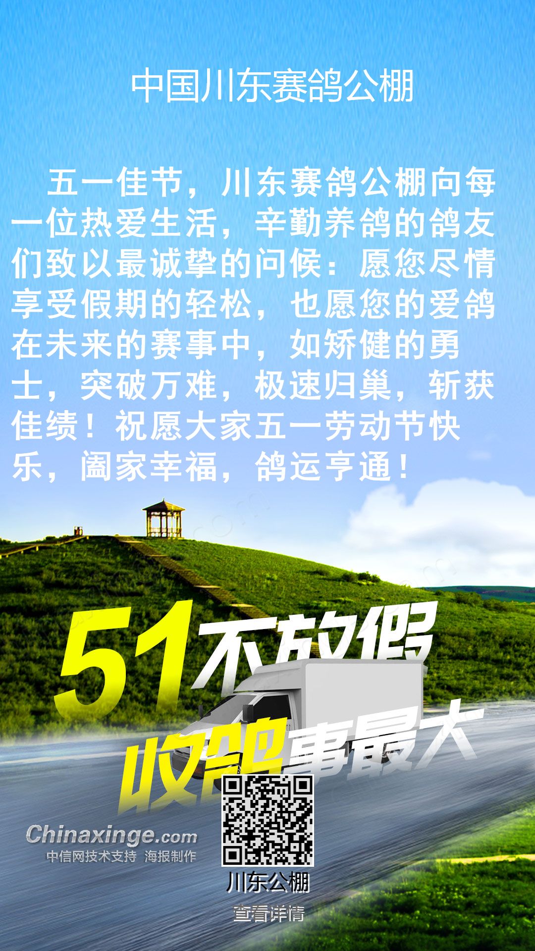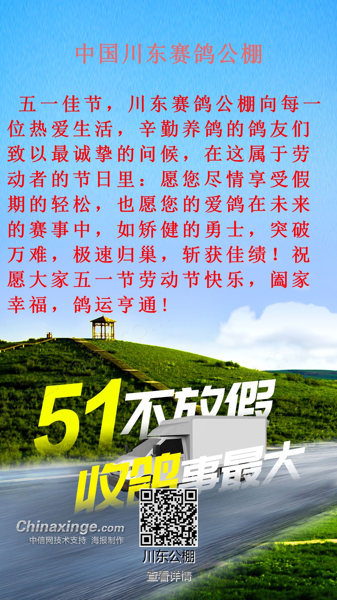 中国川东赛鸽公棚祝鸽友们五一节快乐!