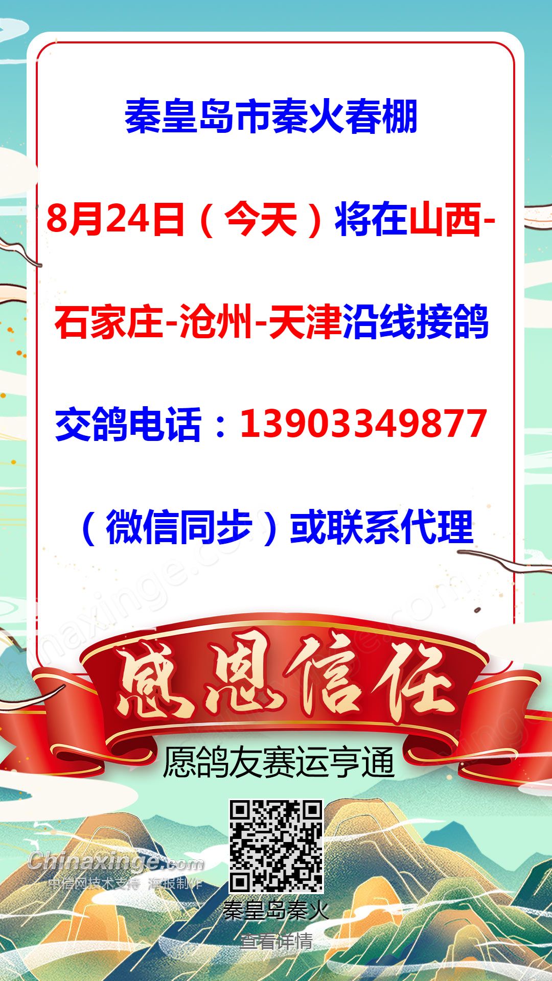 8月24日(今天)将在山西-石家庄-沧州-天津沿线接鸽