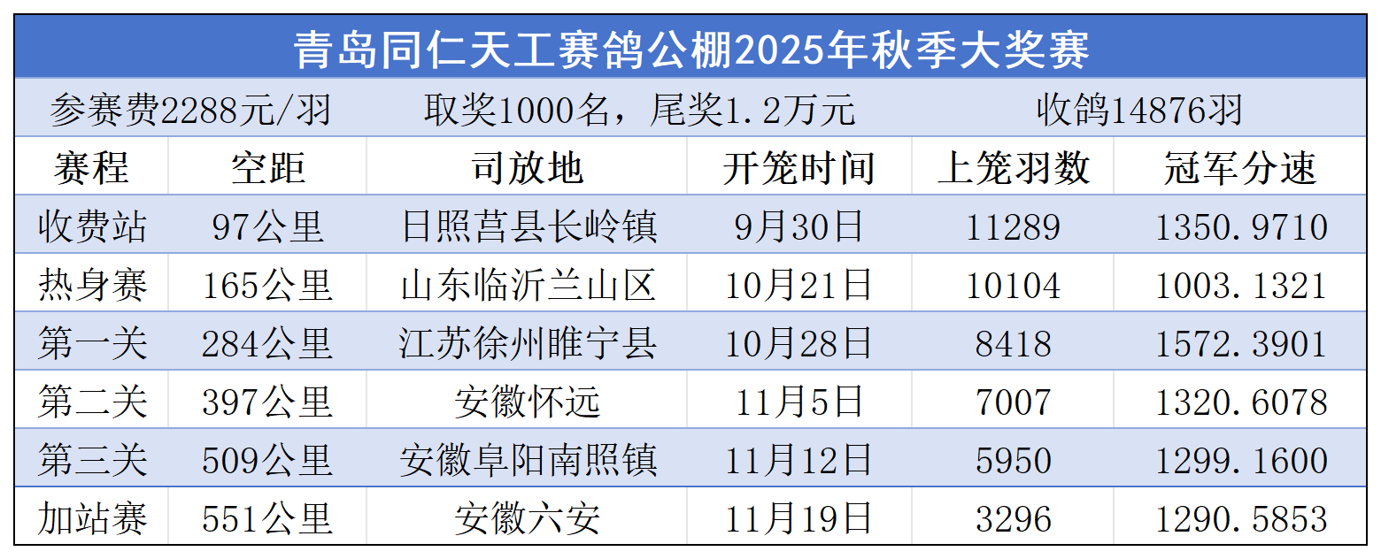 青岛同仁天工赛鸽公棚2025年秋获奖鸽11月24-25日同步拍卖会