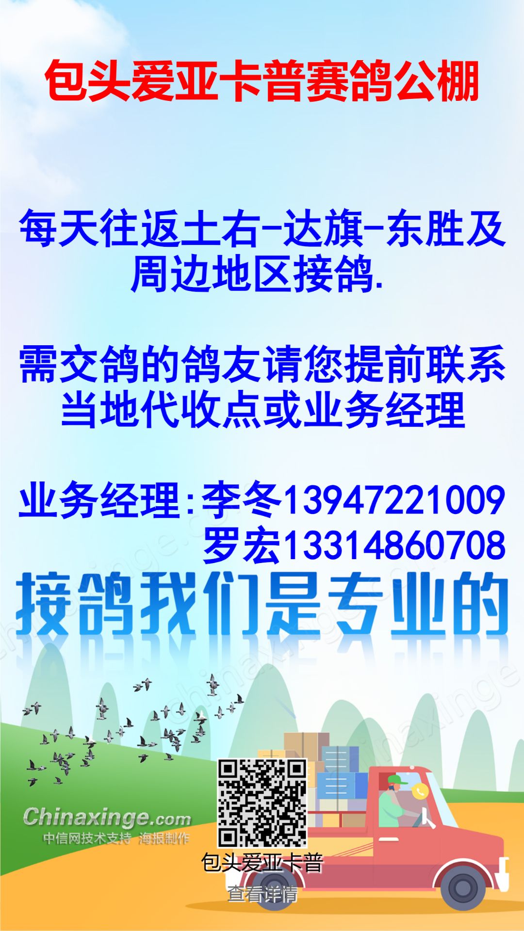 包头爱亚卡普公棚全天接鸽土右-达旗-东胜及周边地区