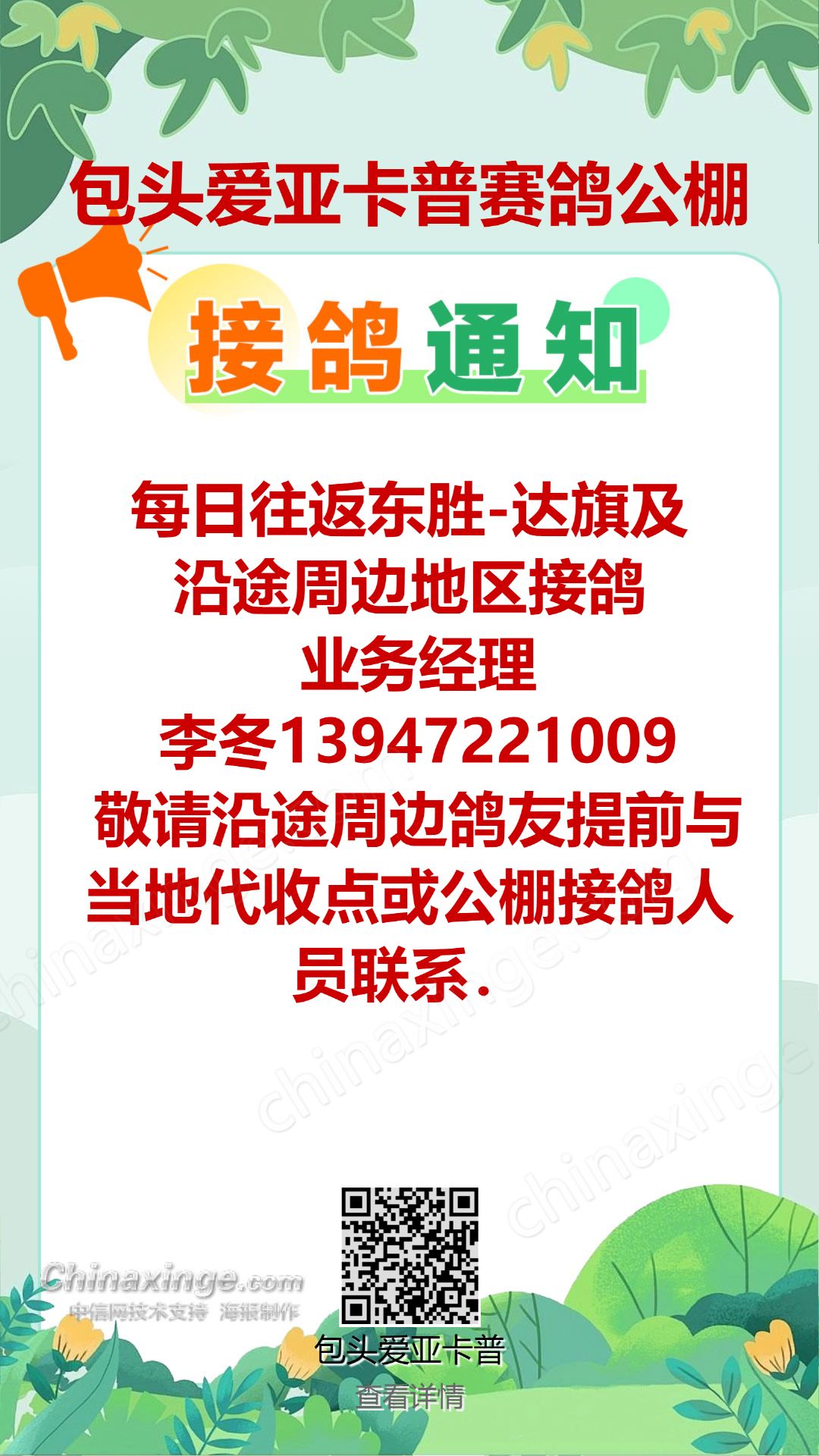 包头爱亚卡普公棚3月18日集宁地区接鸽