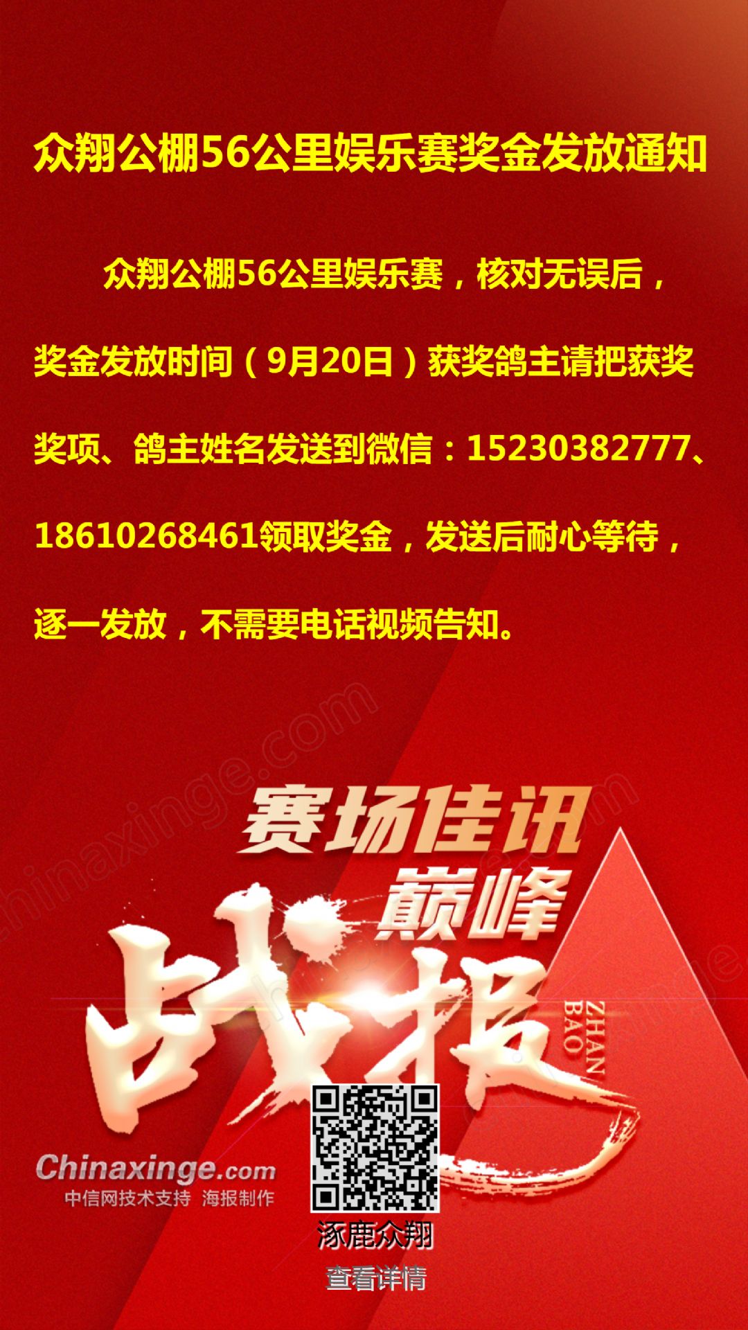 众翔公棚56公里娱乐赛奖金发放通知