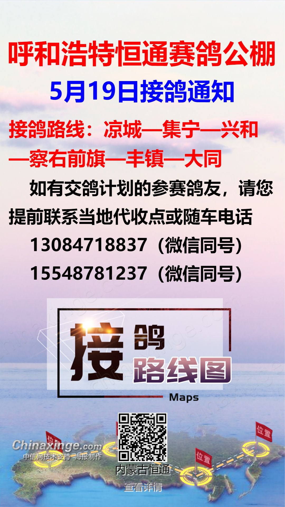 恒通赛鸽公棚5月18日集宁、化德方向接鸽通知