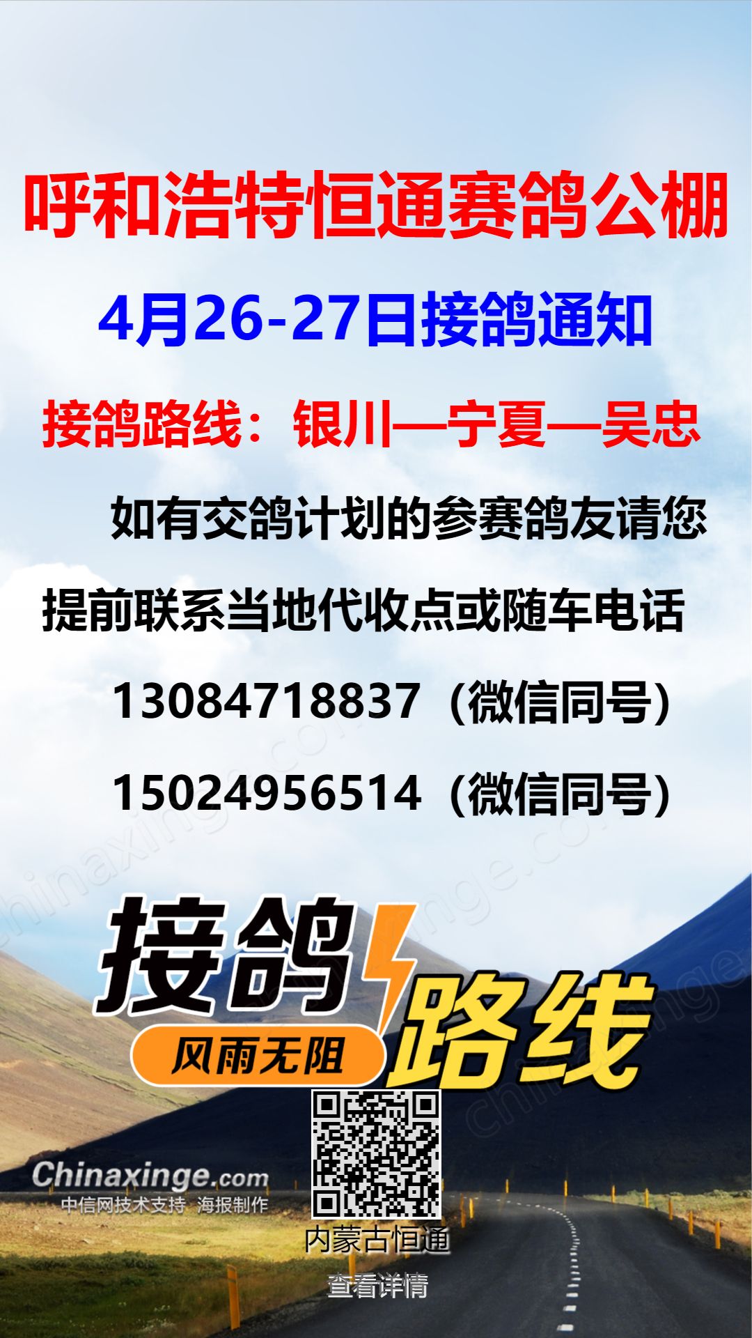 恒通赛鸽公棚4月26-27日银川-宁夏-吴忠方向接鸽通知