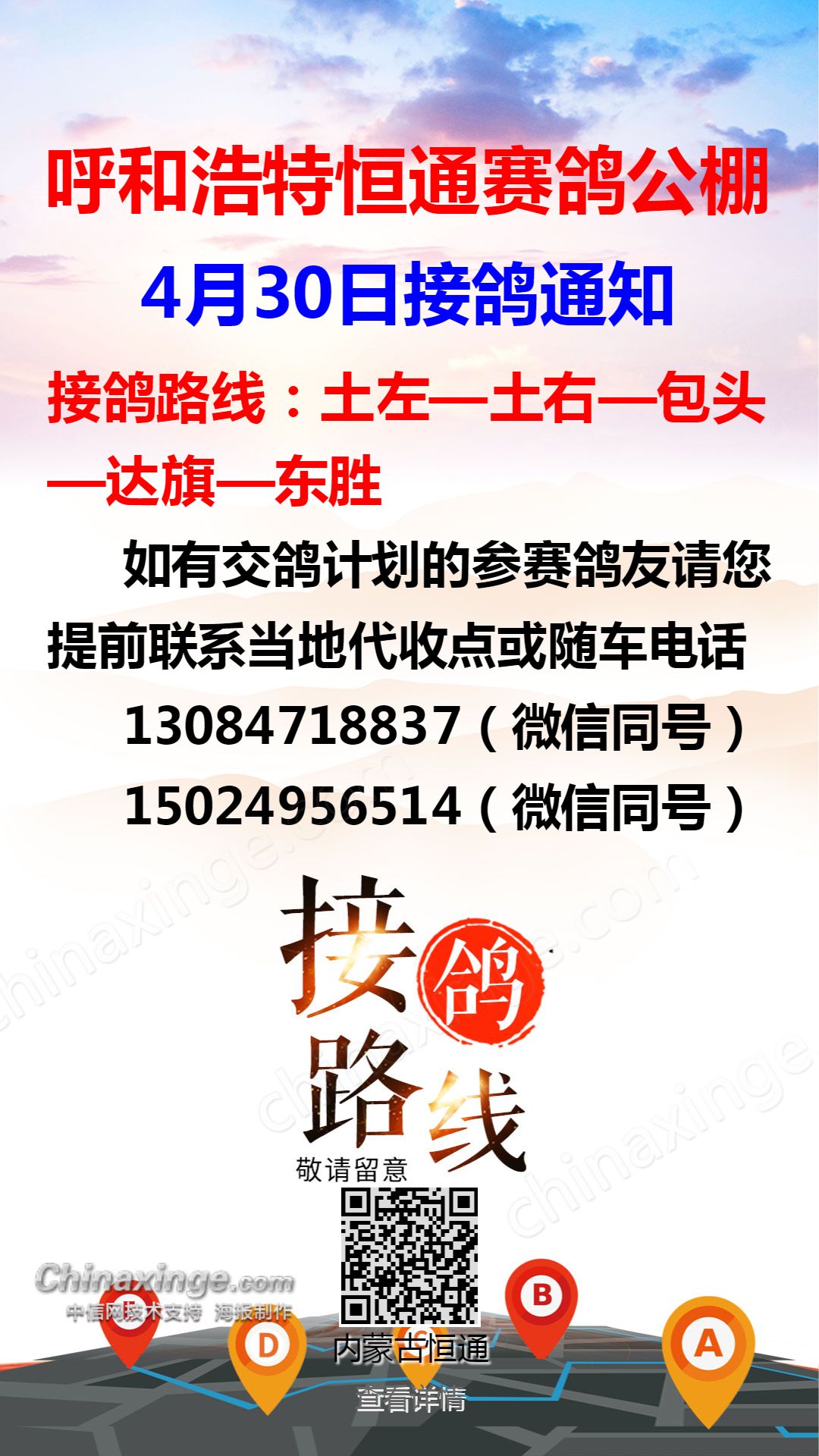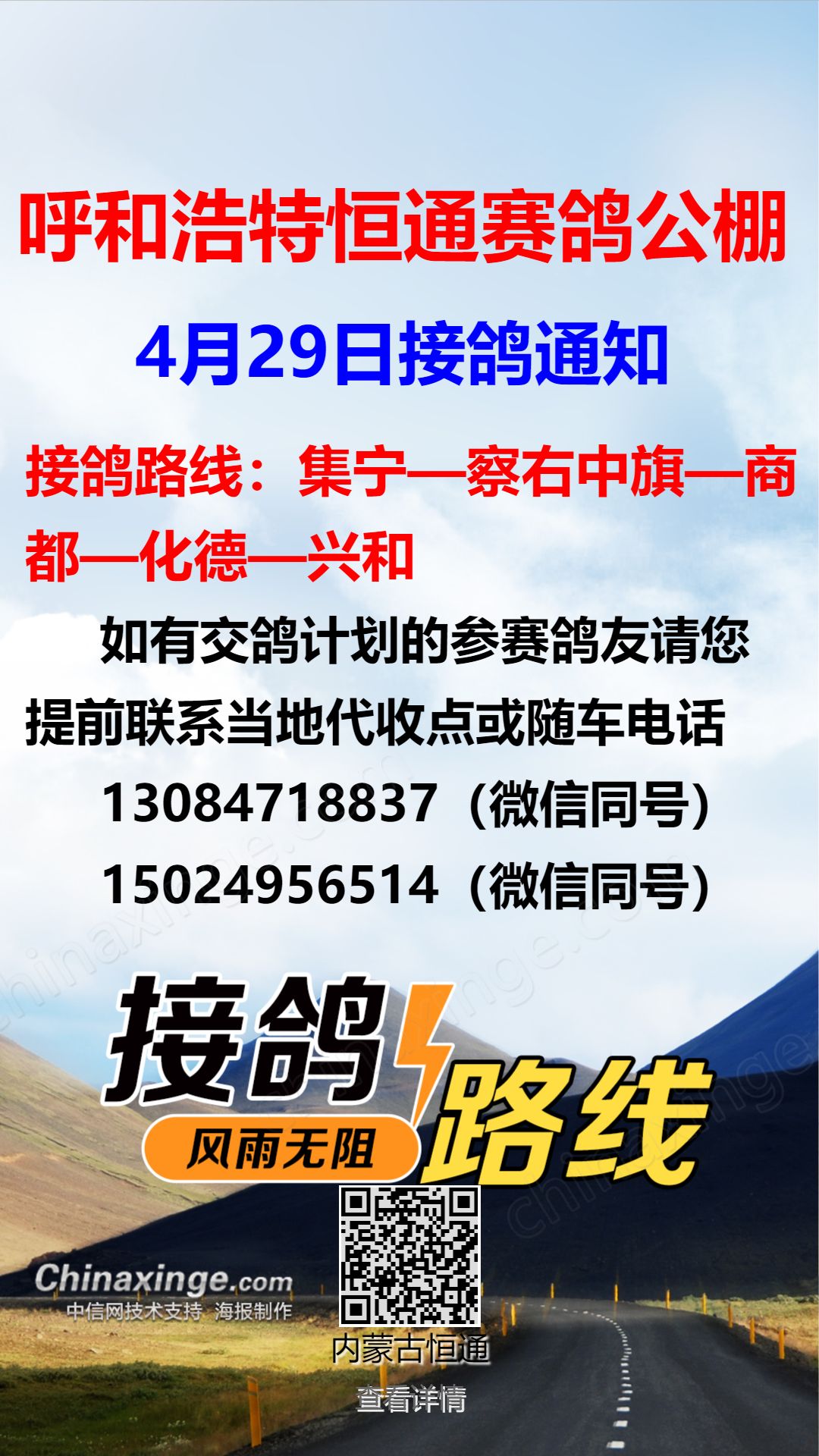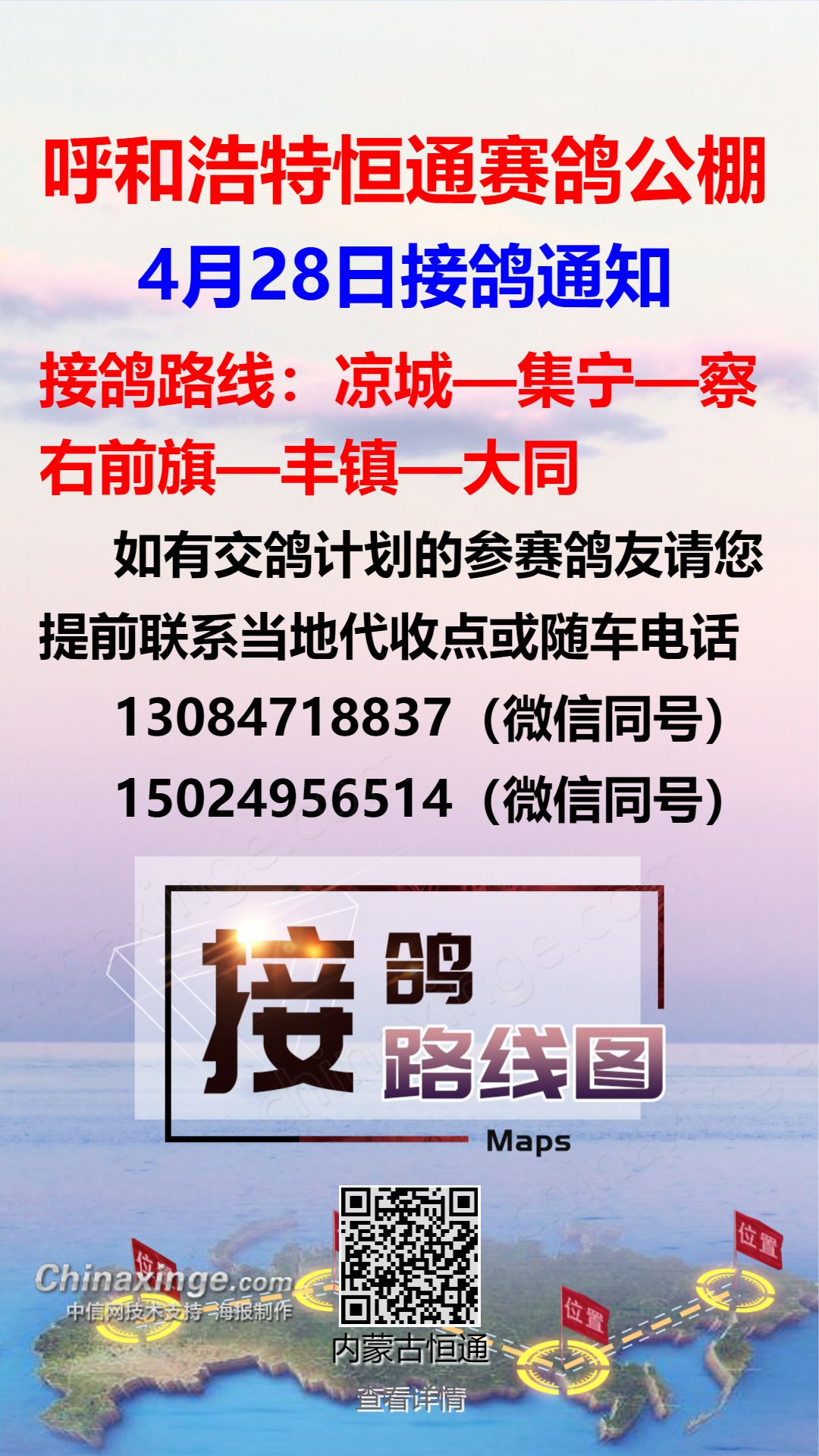 恒通赛鸽公棚4月29日集宁、化德方向接鸽通知