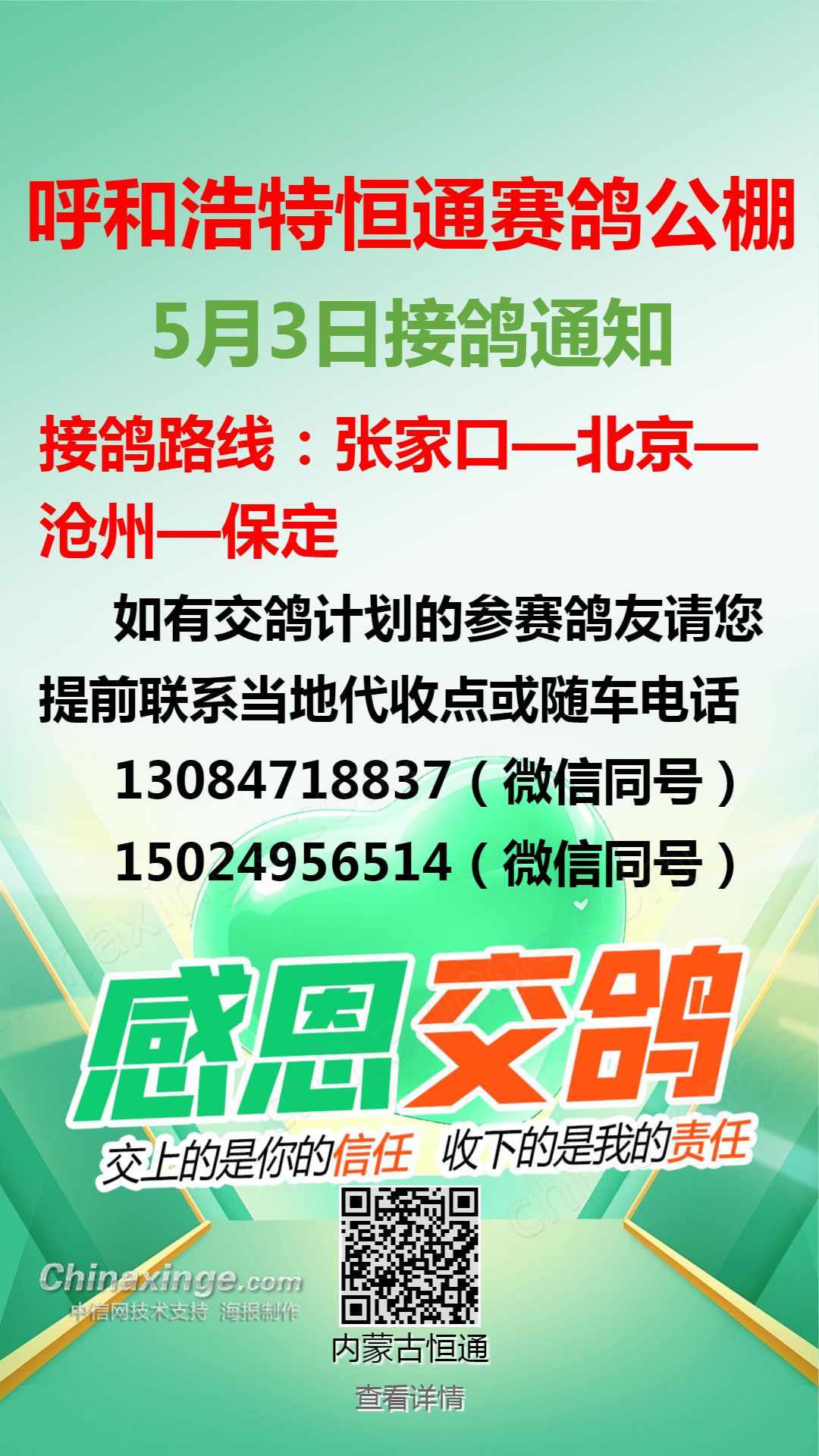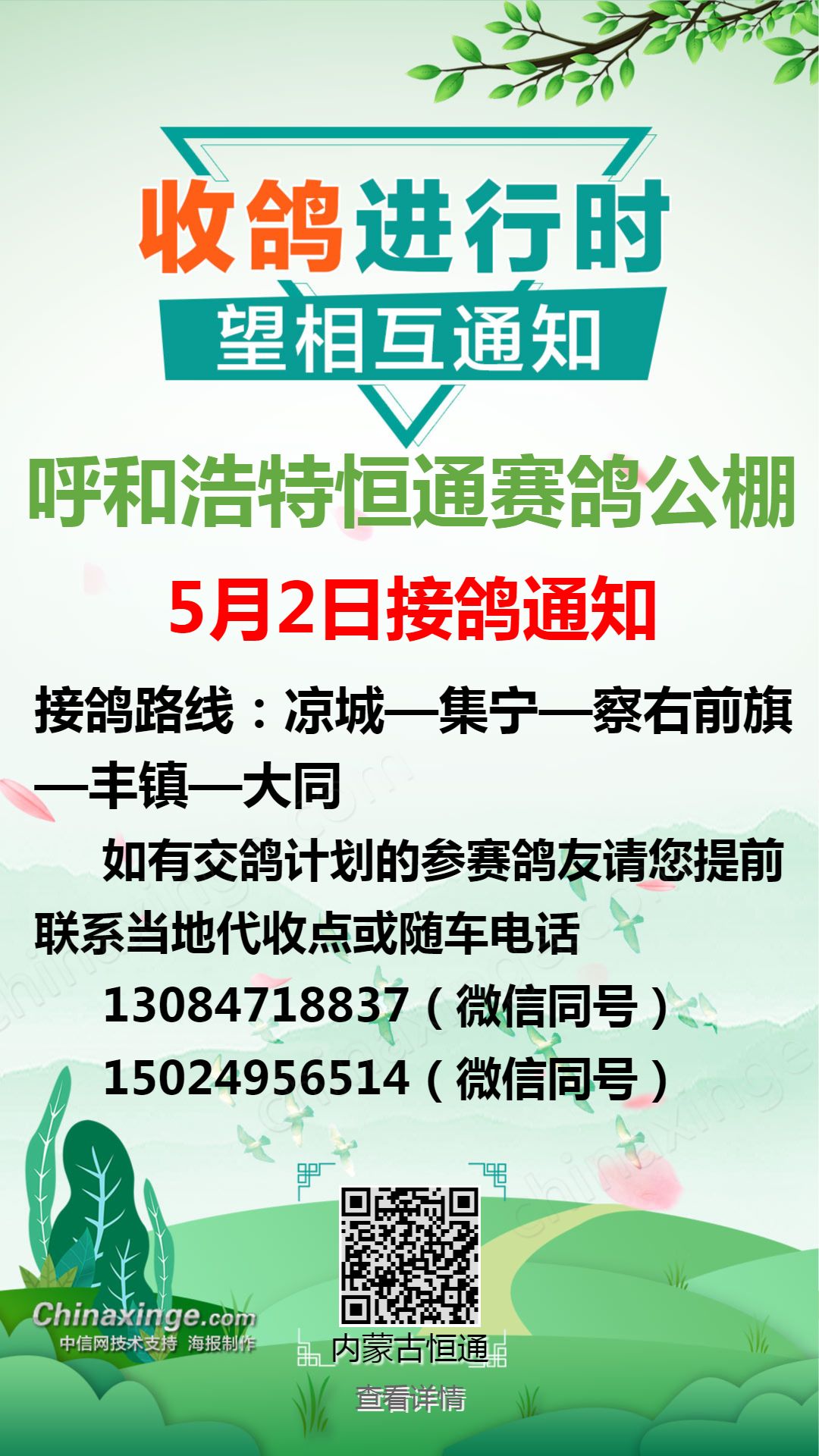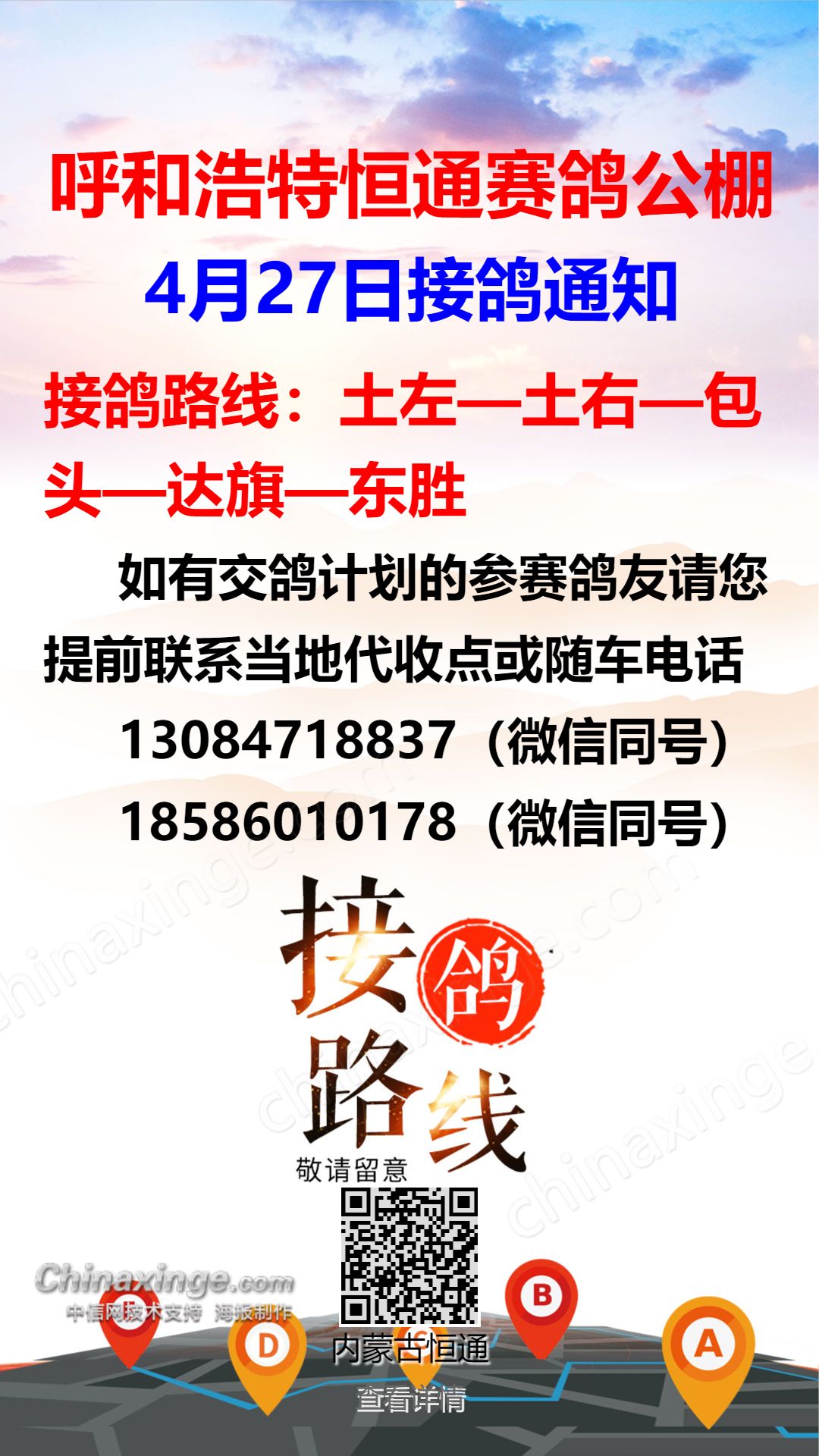 恒通赛鸽公棚4月29日集宁、化德方向接鸽通知