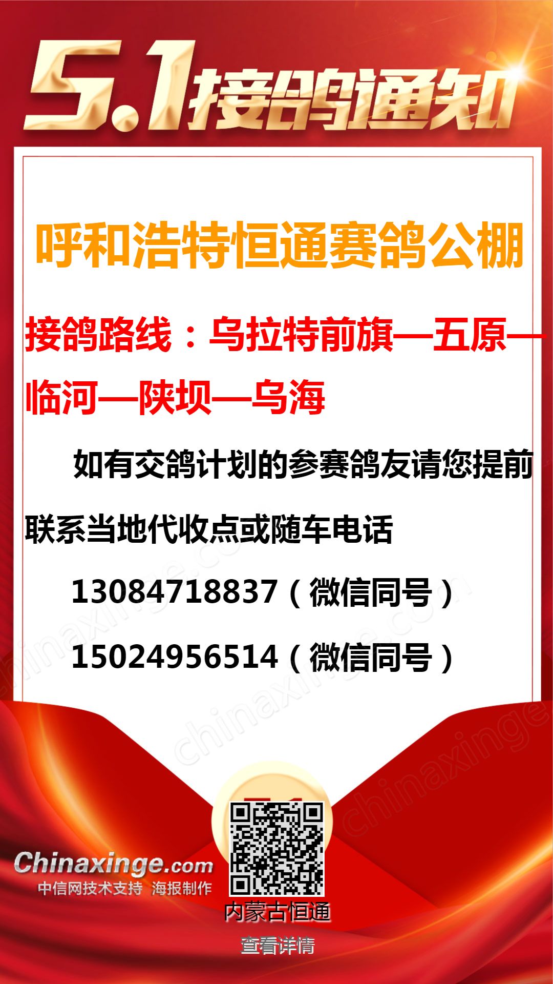 恒通赛鸽公棚5月1日临河、乌海方向接鸽通知