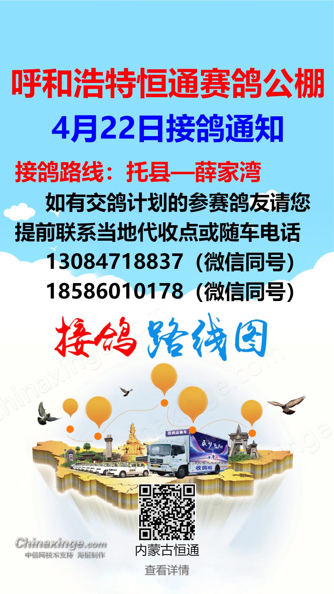 恒通赛鸽公棚4月22日托县方向接鸽通知