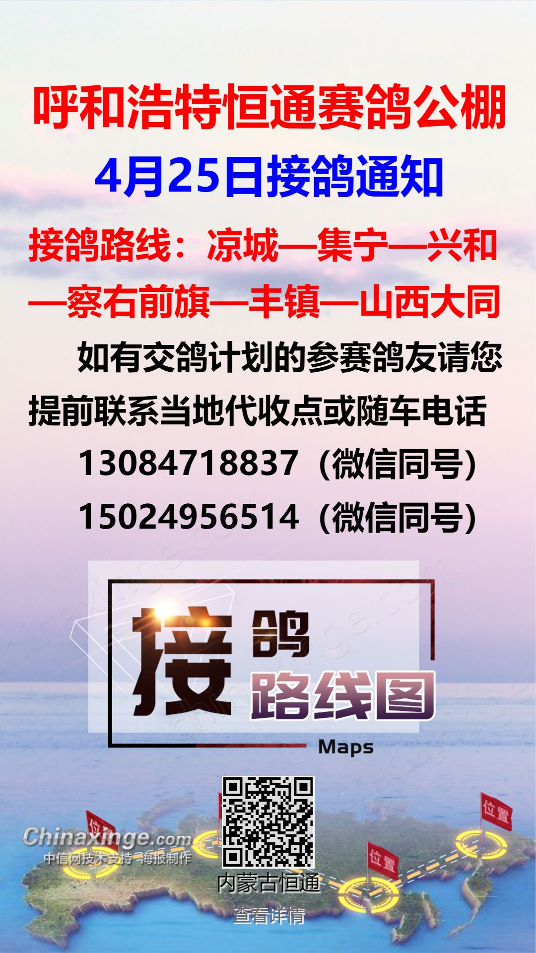 恒通赛鸽公棚4月25日集宁、大同方向接鸽通知