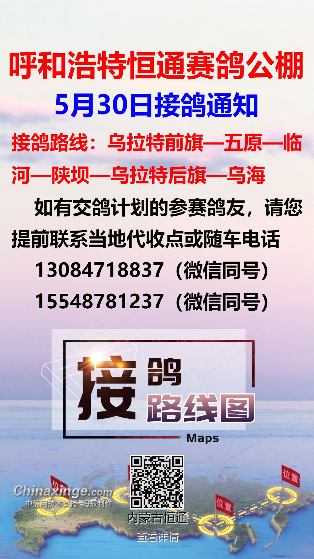 恒通赛鸽公棚5月30日托县、薛家湾方向接鸽通知