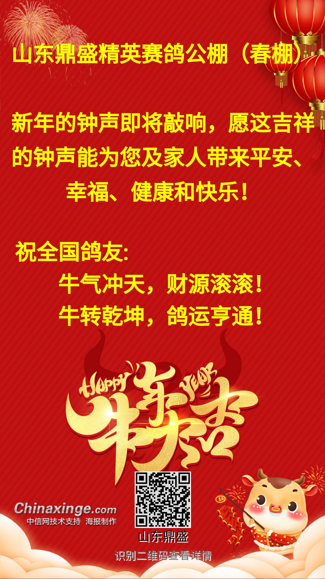 山东鼎盛精英赛鸽公棚祝全国鸽友牛年大吉!