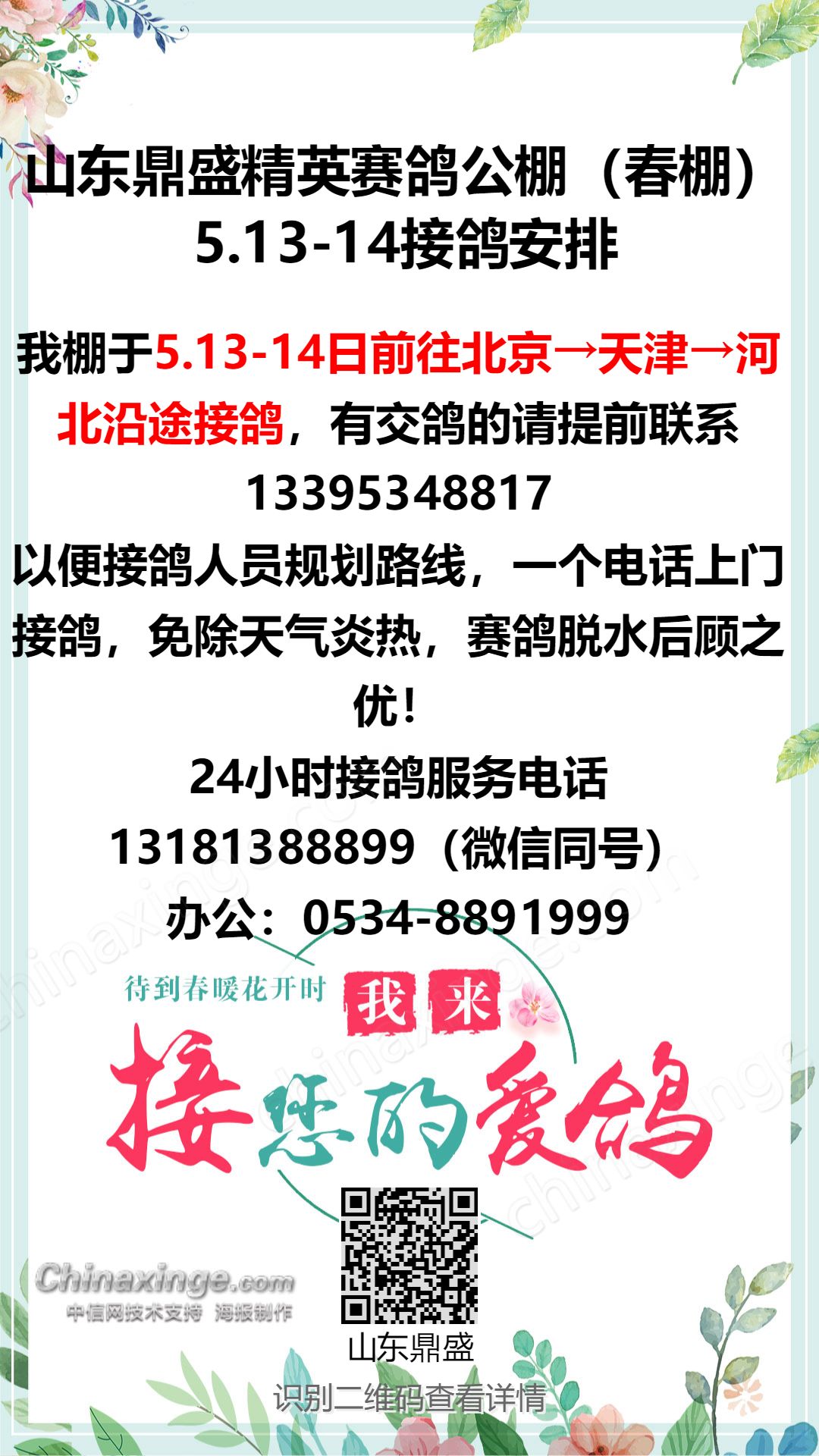 山东鼎盛精英赛鸽公棚5.13-14赴北京、天津、河北接鸽