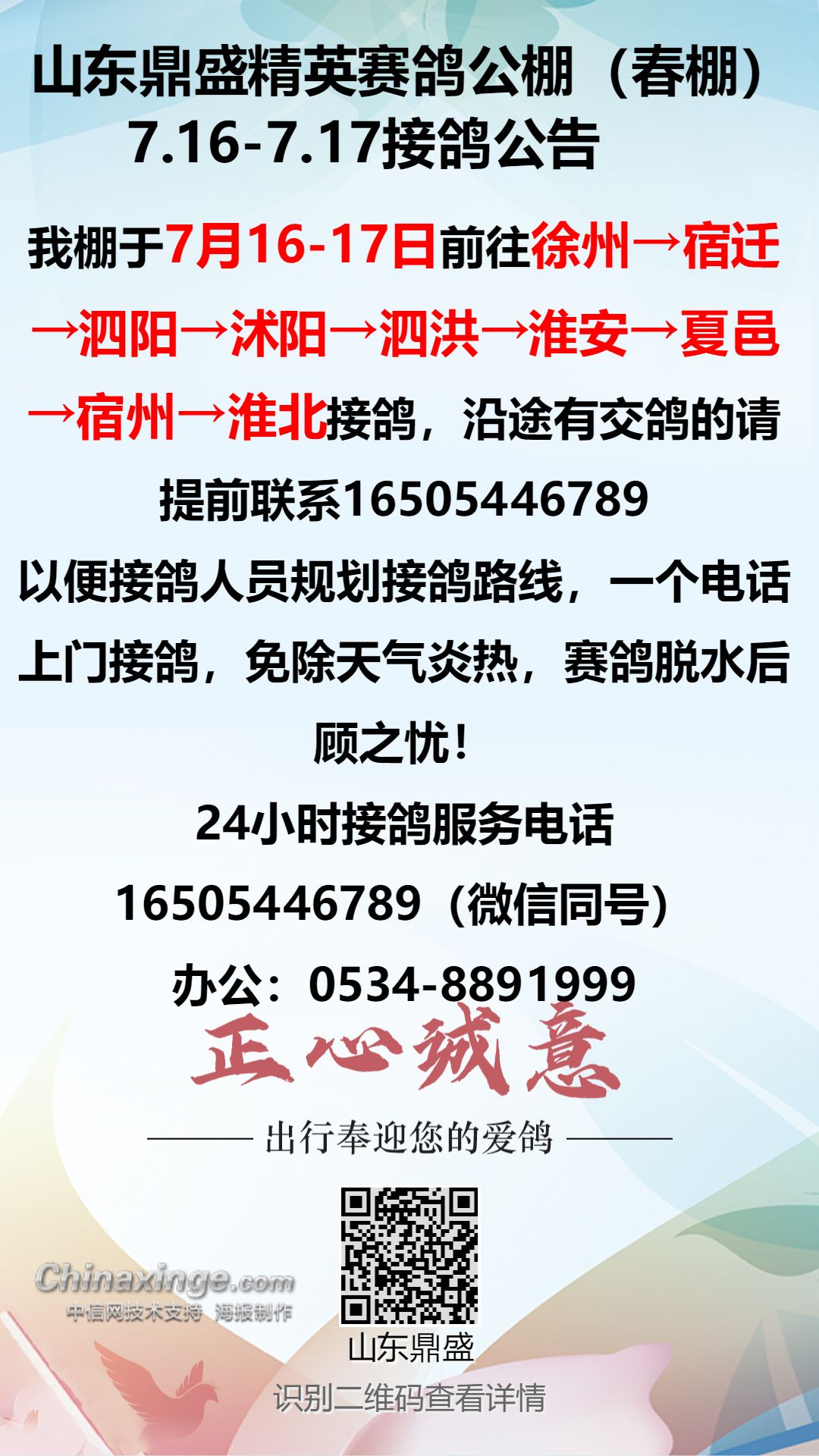 山东鼎盛精英赛鸽公棚(春棚) 7.16-7.17赴江苏接鸽安排