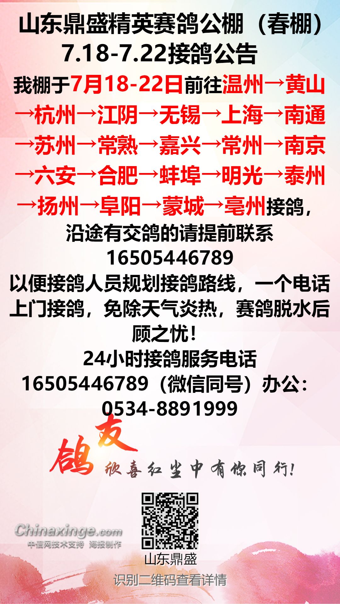 山东鼎盛精英赛鸽公棚(春棚) 7.18-7.22赴上海、安徽接鸽安排