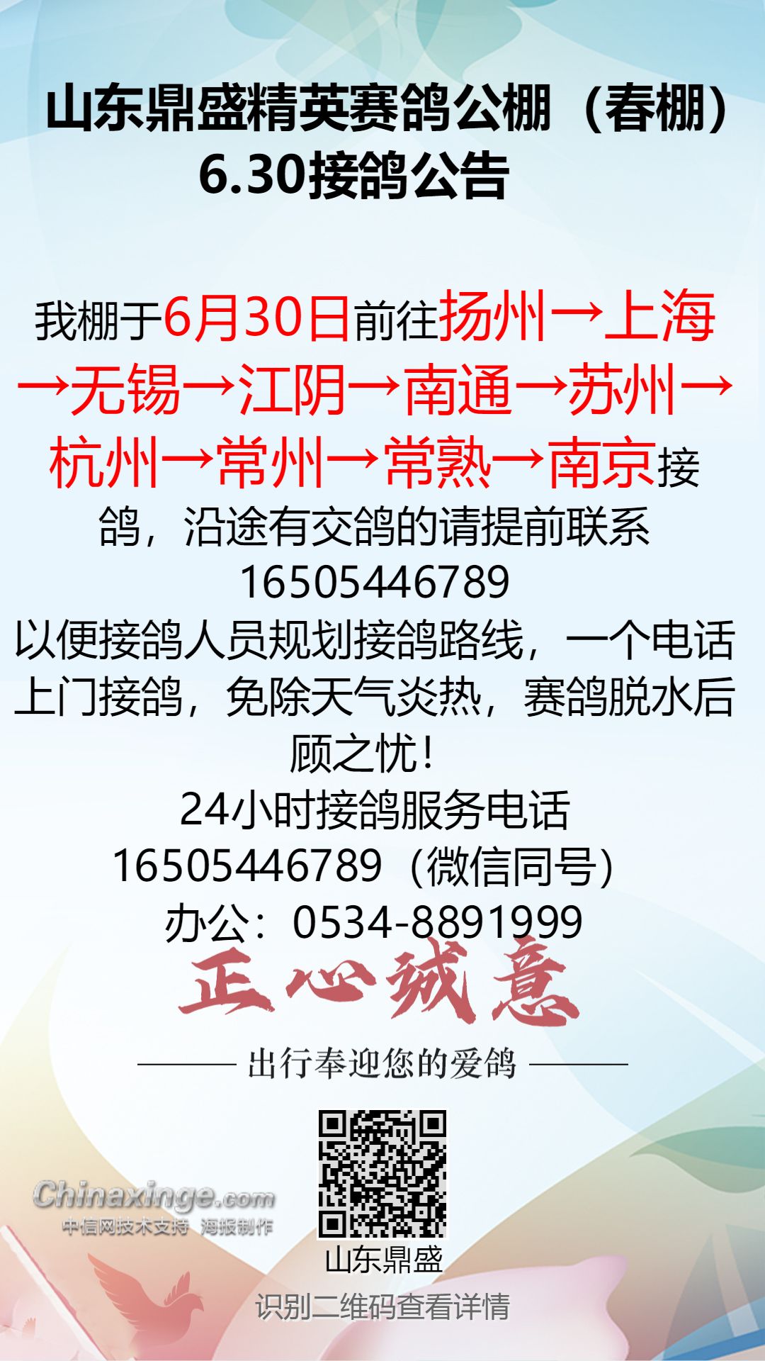 山东鼎盛精英赛鸽公棚(春棚) 6.30赴河北、山东接鸽安排