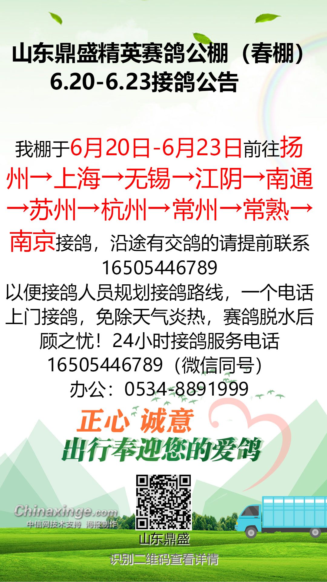 山东鼎盛精英赛鸽公棚(春棚) 6.23赴湖北接鸽安排