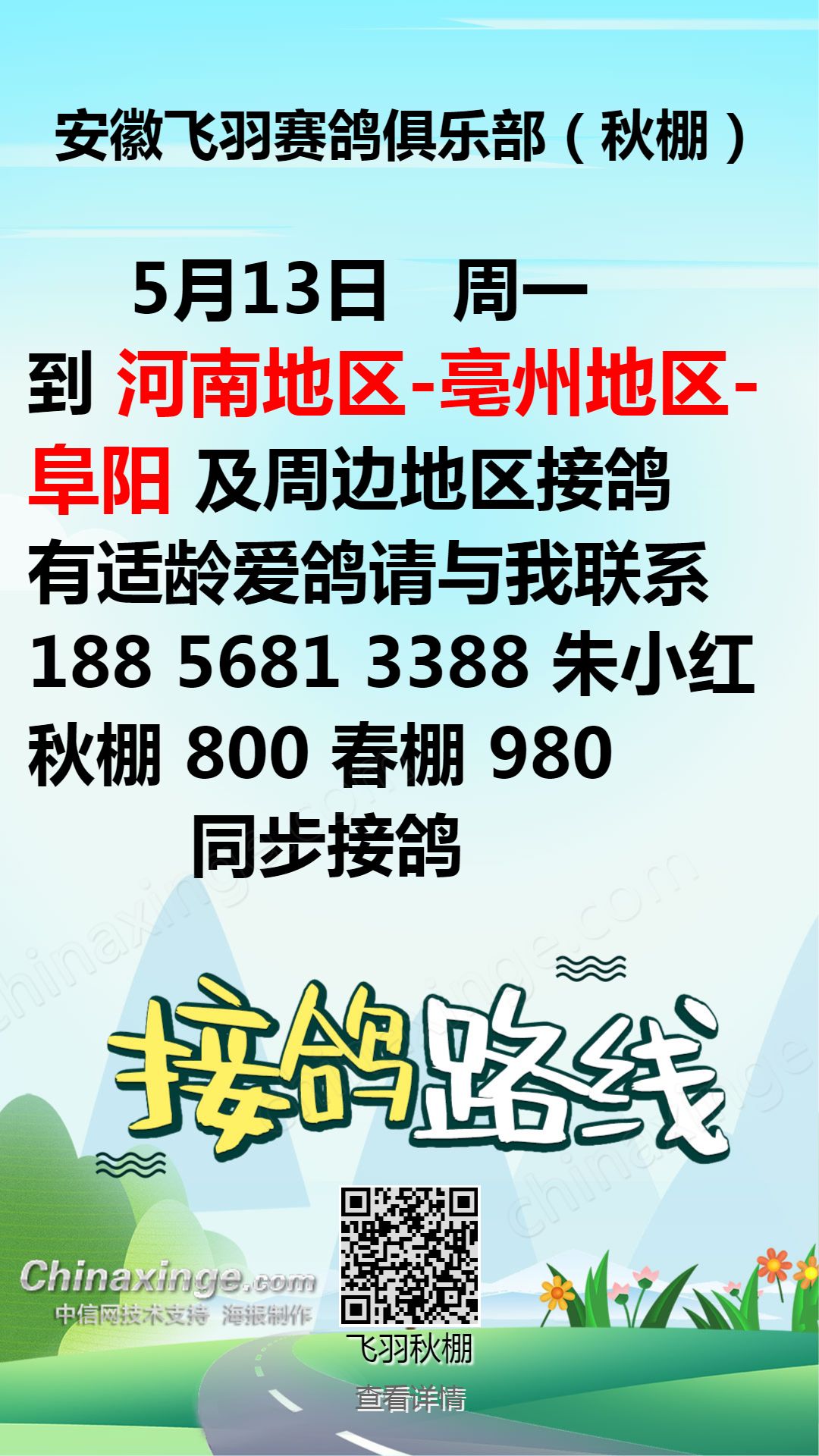 安徽飞羽赛鸽俱乐部:5月13日接鸽公告