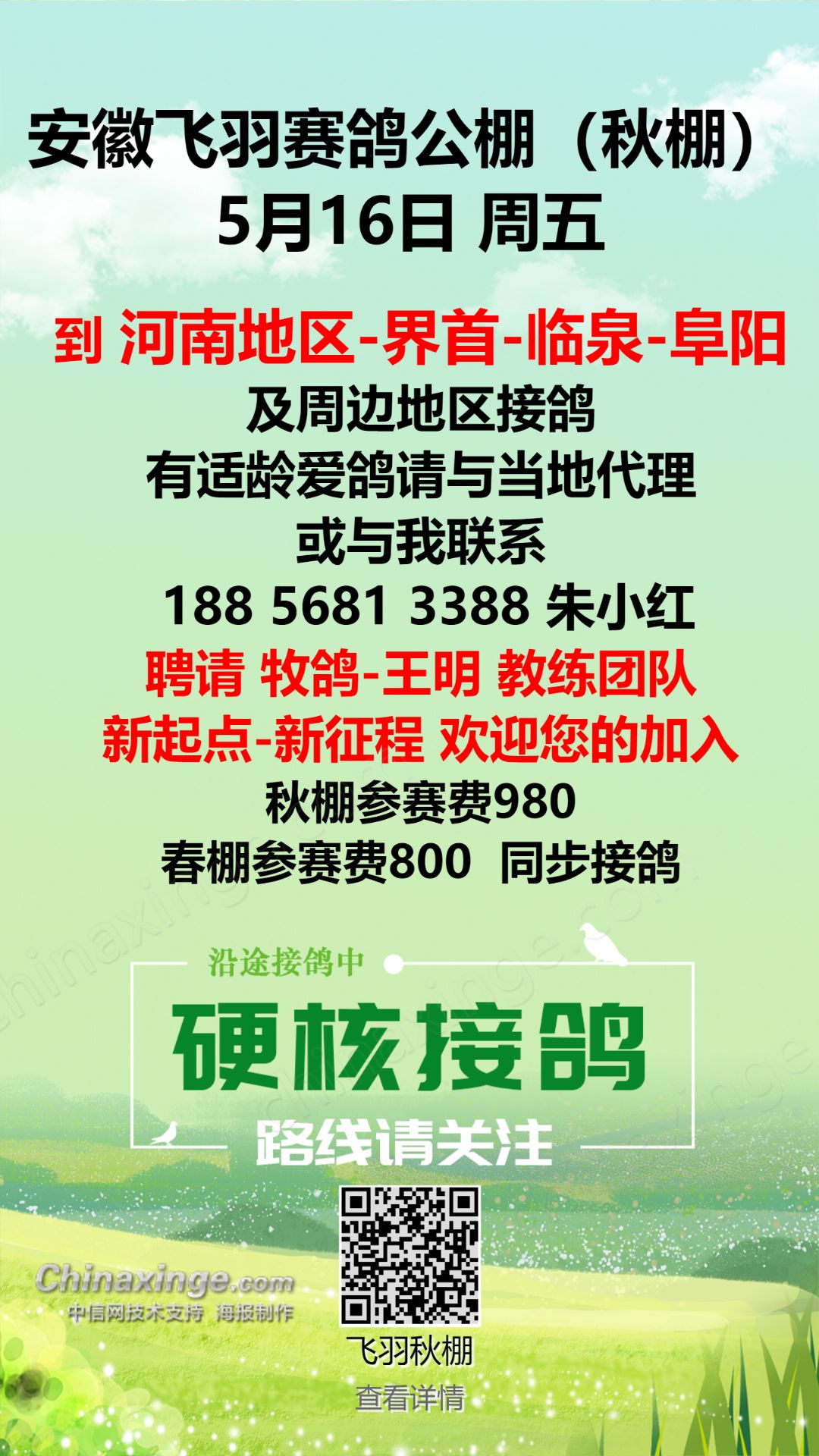 安徽飞羽公棚(秋) :5月17日 周六 接鸽公告