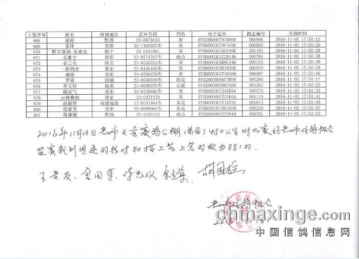贵阳天喜赛鸽中心450公里加站赛上笼裁判签字盖章图