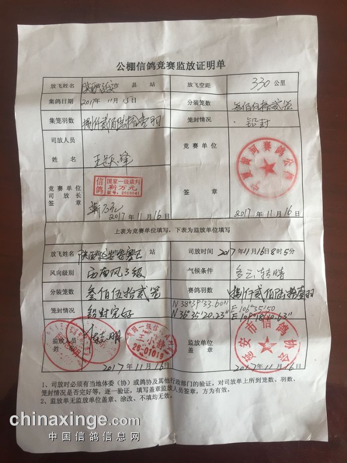 公棚信鸽竞赛监放证明单