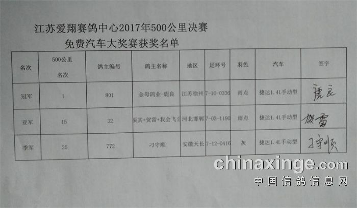 500公里决赛冠军,免费汽车挑战赛冠军“金母鸽业-鹿良”领取奖车,获奖鸽主电话:15952200644