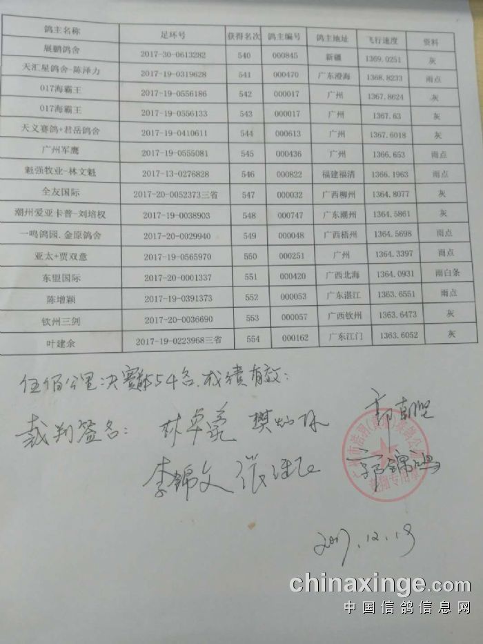广州浩羽(黄埔)公棚第一关热身赛前100名获奖鸽名单
