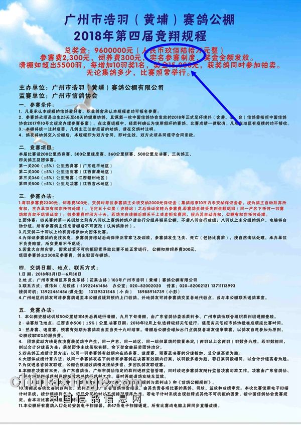 2018年规程印刷体从3月10日开始已陆续寄给各地代理处,今年的规程已注明是实名参赛制度,请各位代理在登记集鸽单时一定要登记实名,若是以鸽舍名称参赛,也需加上实名后缀,谢谢大家的配合!