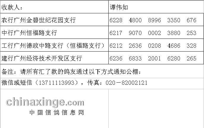 3、请诸位代理统计好集鸽数据,我们会逐一核对今年的代理鸽数与代收的保证金总额;未交保证金的鸽户请在7月20日之前自觉交纳保证金2000元,清棚后保证金转为参赛费,若鸽主无缘今年的比赛,保证金原数退回,感谢大家的支持与信任!