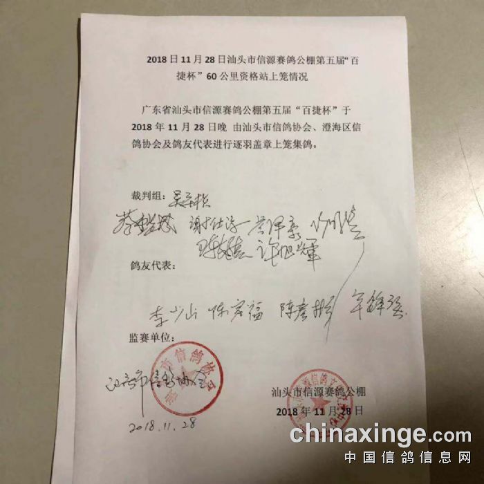 汕头信源公棚11月28日资格站(约60公里)集鸽现场相片1