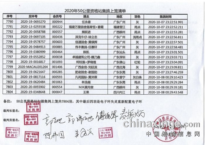 广州浩羽(黄埔)公棚第一关3日归巢有效名单(开笼起至第三天19:00为有效报到期)