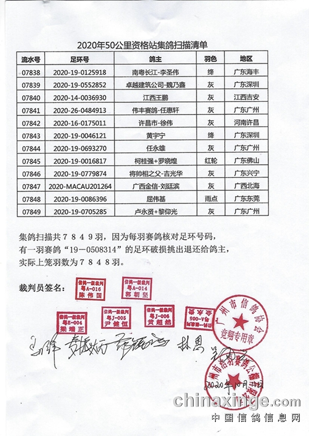 广州浩羽(黄埔)公棚第一关3日归巢有效名单(开笼起至第三天19:00为有效报到期)