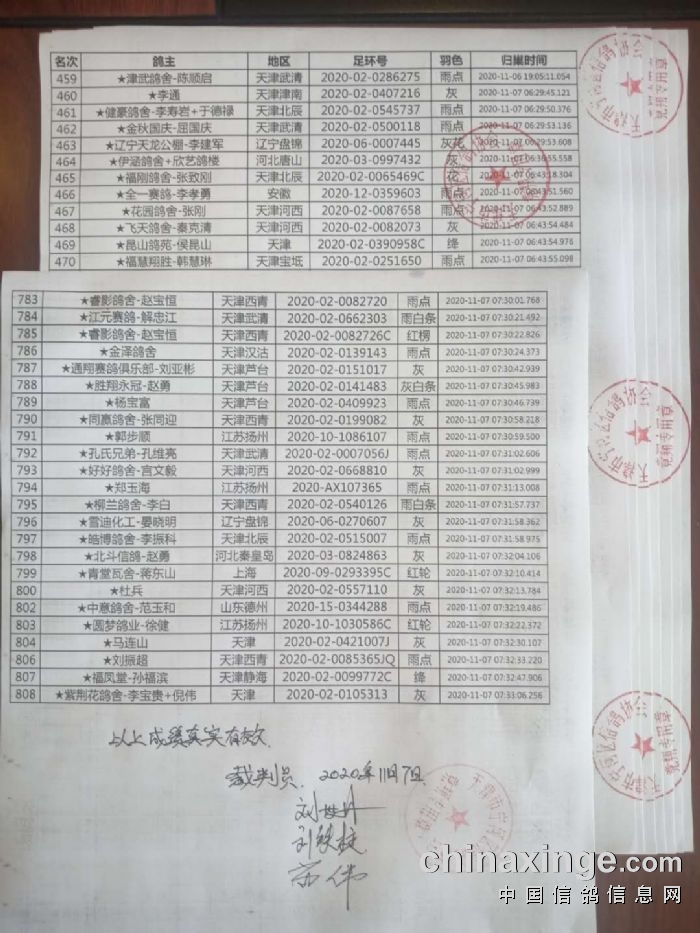 天津信泽慧海公棚决赛报到有效期为第一羽赛鸽归巢后至次日晚18点结束,明日由天津市宁河区信鸽协会裁判组对次日归巢赛鸽逐羽检验,封环如发生严重破损取消此鸽成绩及奖金,名次及奖金下移。并由马良赛鸽传媒团队对归巢验鸽进行全程跟踪直播。欢迎广大鸽友到场监督。